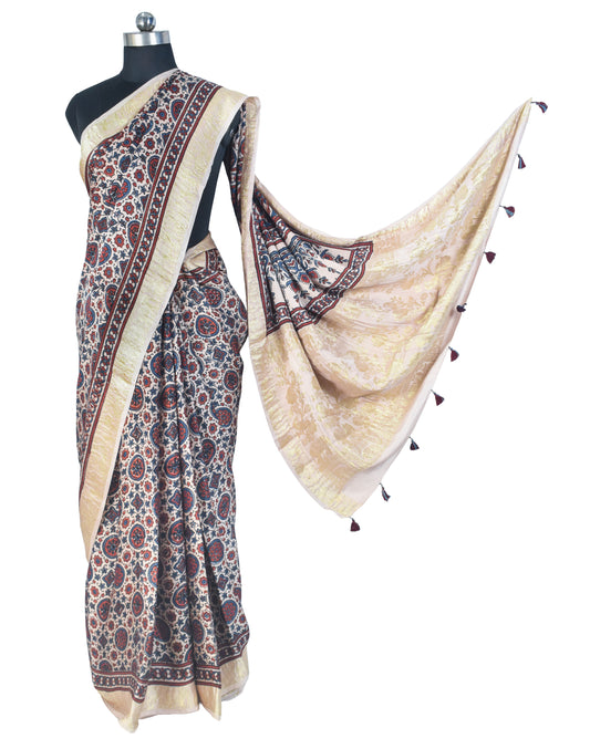 Ajrakh Modal Silk Natural Dye Designer Hand Block Print Saree With Full nakshi Border & Pallu - With Blouse Piece - 5.5 Mtr Length - SKU : IA06501A