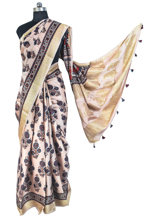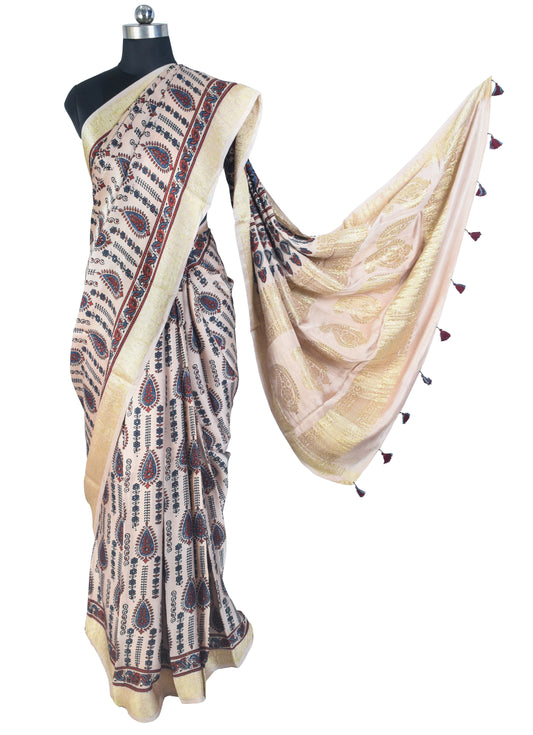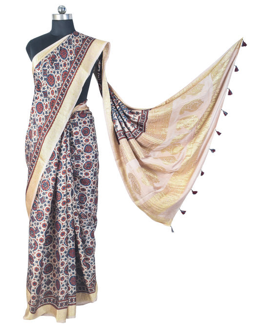 Collection: Ajrakh Modal Silk Natural Dye Designer Hand Block Print Saree With Full nakshi Border & Pallu