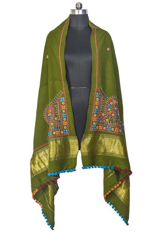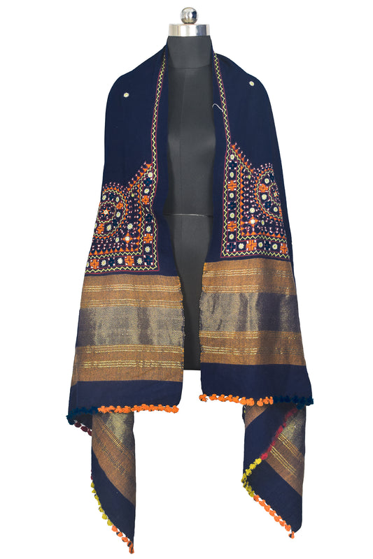 Mirror Work Wool Hand Embroidered Shawl with Tassels - 2.1 Mtr Length - SKU : BM20B02D