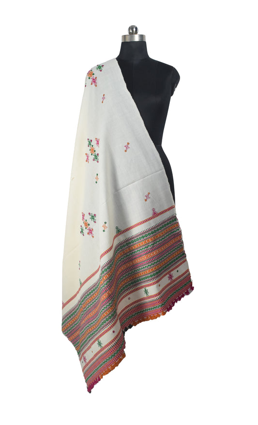 Simple Mirror Work Wool Hand Embroidered Shawl with Tassels - 2.1 Mtr Length - SKU : BM27A01B