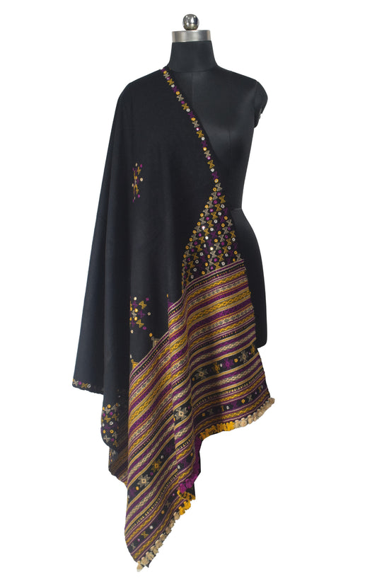 Mirror Work Wool Lagdi Patto with Tassels Shawl - 2.1 Mtr Length - SKU : RD24B01E