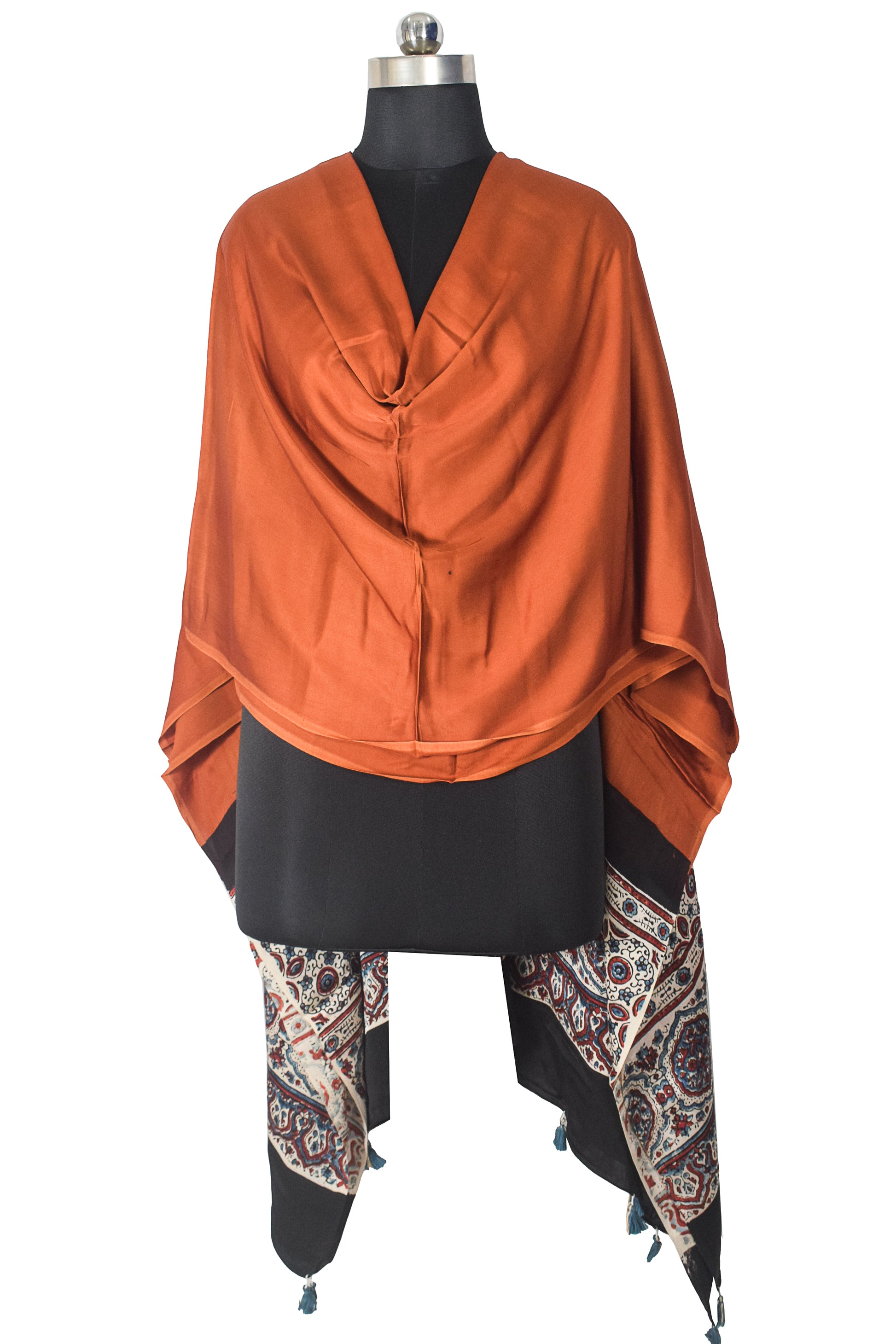 Ajrakh Modal Silk Part Natural Dye Half Plain Dyeing Hand Block Print Dupatta with Tassels - 2.5 Mtr Length - SKU : AI21701I
