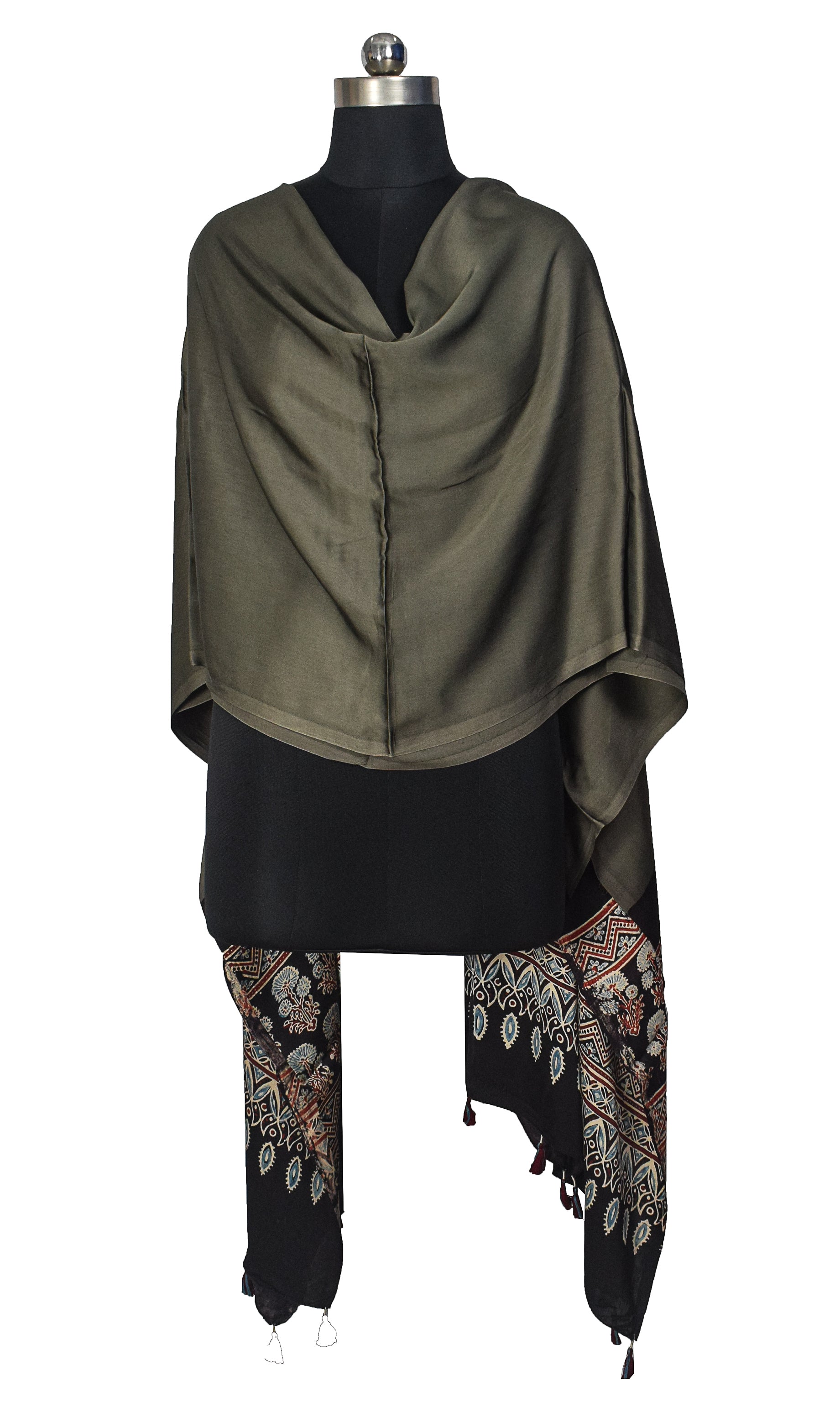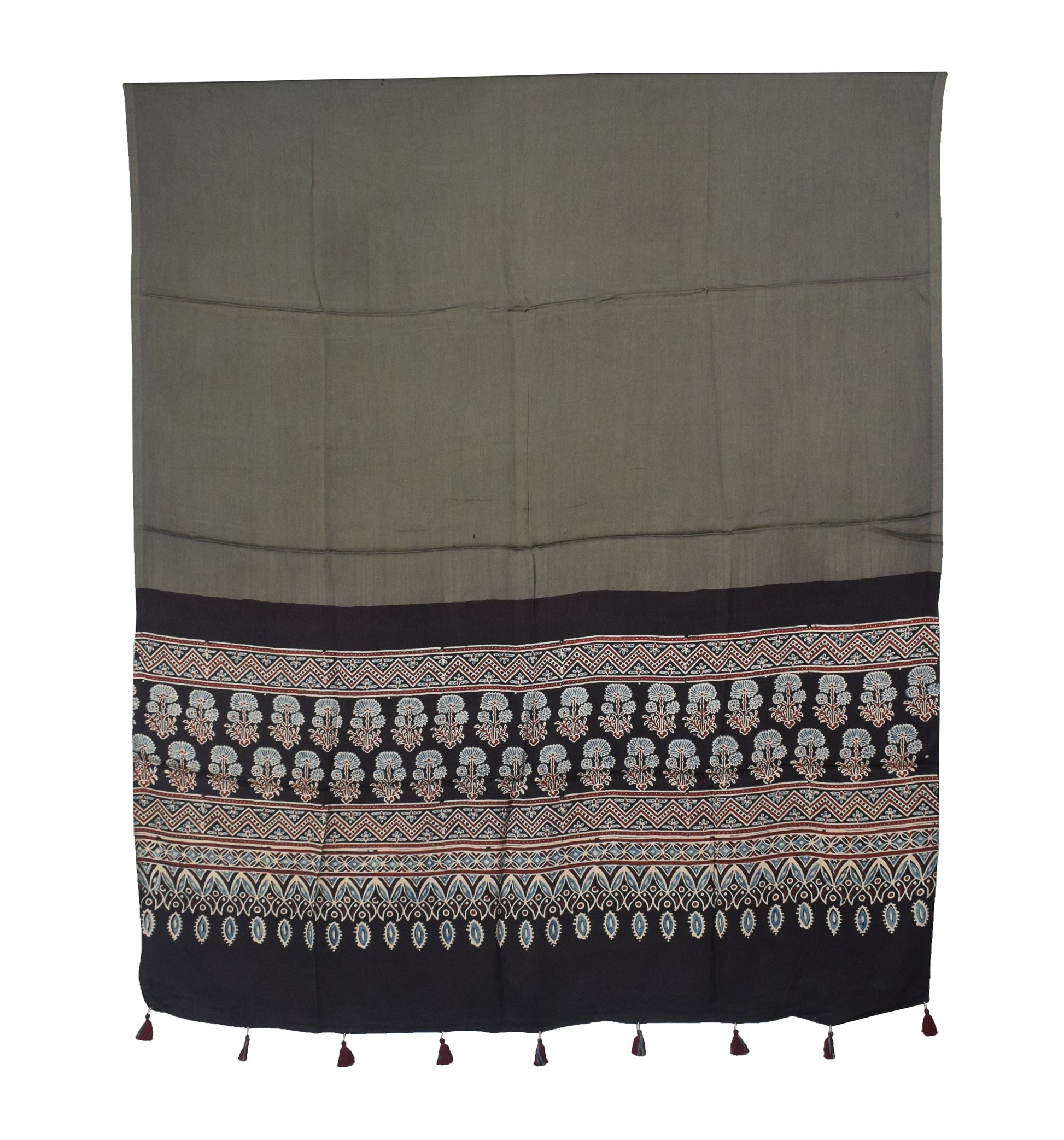 Ajrakh Modal Silk Part Natural Dye Half Plain Dyeing Hand Block Print Dupatta with Tassels - 2.5 Mtr Length - SKU : AI2014AM