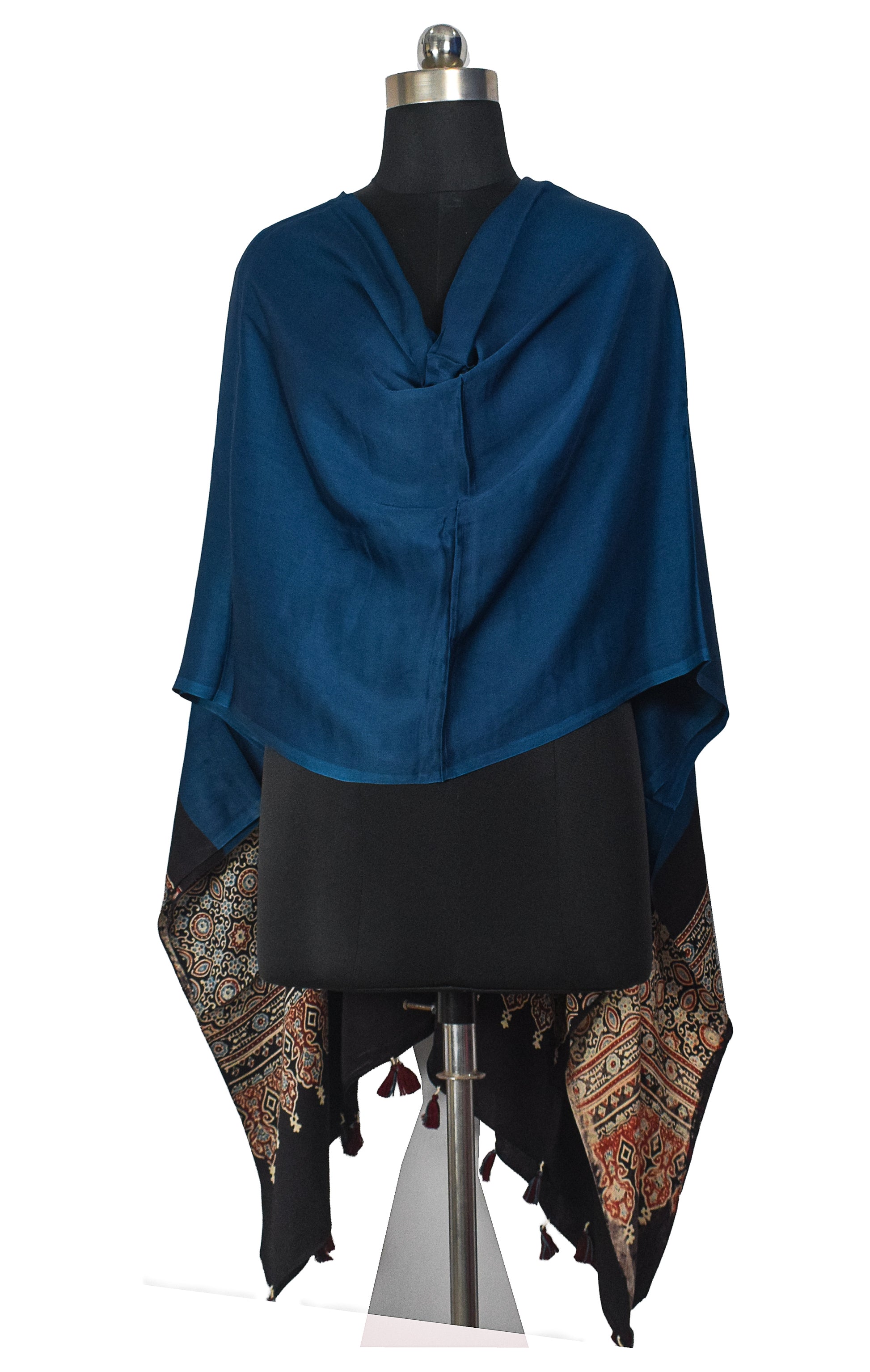 Ajrakh Modal Silk Part Natural Dye Half Plain Dyeing Hand Block Print Dupatta with Tassels - 2.5 Mtr Length - SKU : AI2014AB