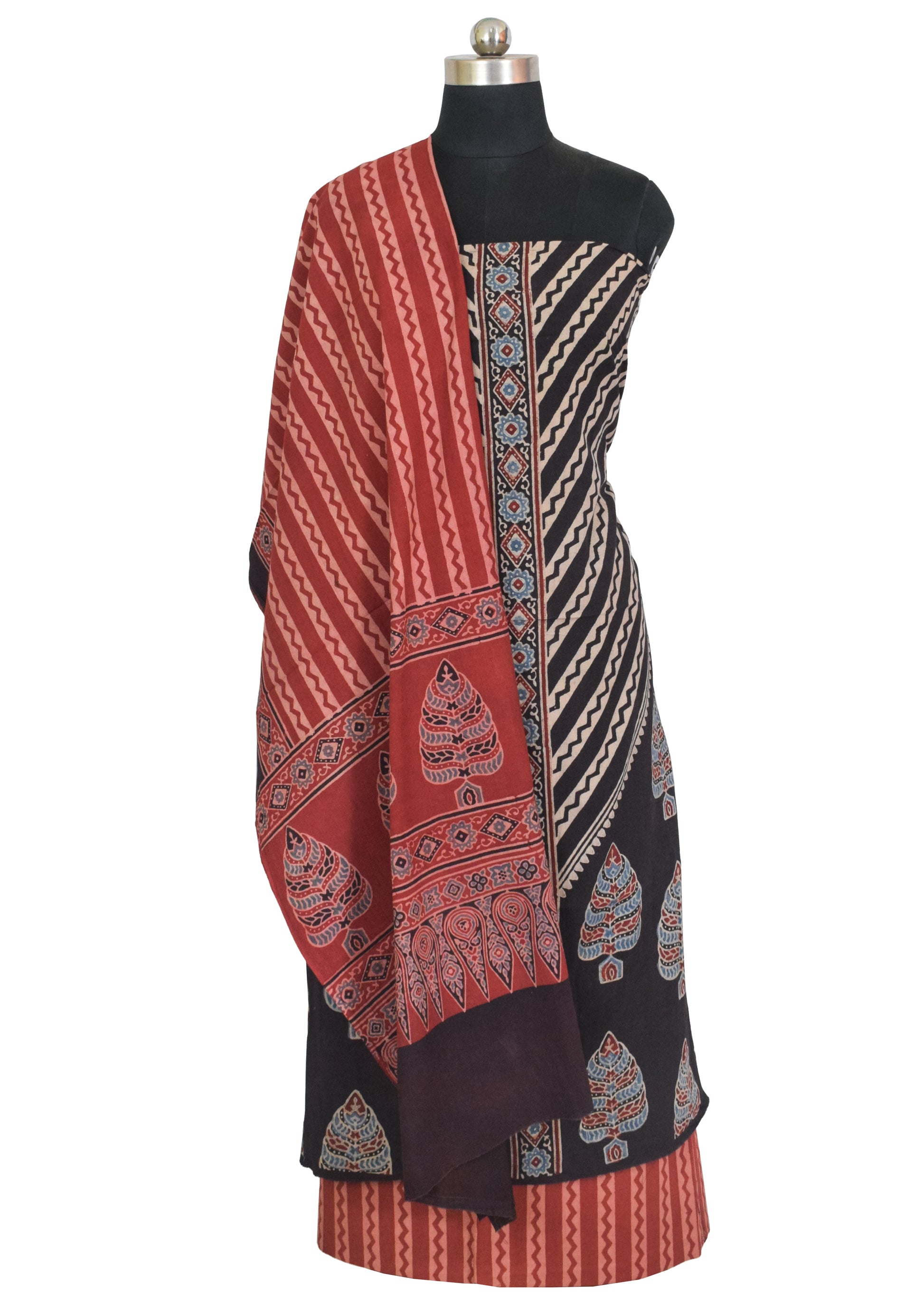 * UNIQUE FEATURE : Premium Three Colour Ajrakh Hand Printed Natural Dyes Dress Material, with all Top, Bottom, Dupatta printed in Three Colour i.e Whole multi step Ajrakh Printing process repeated three times with different colour and block. Skin and Eco Friendly. Large 2.5 mtr x 1.12 mtr wide Premium Full Printed Ajrakh Dupatta.