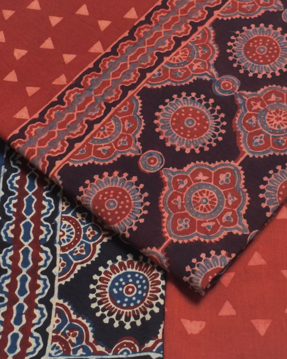 Ajrakh Cotton Natural Dye Three Colour Full Printed Hand Block Print Dress Material with 44 Inch wide Dupatta - 2.5 Mt Top - SKU : AI03501R