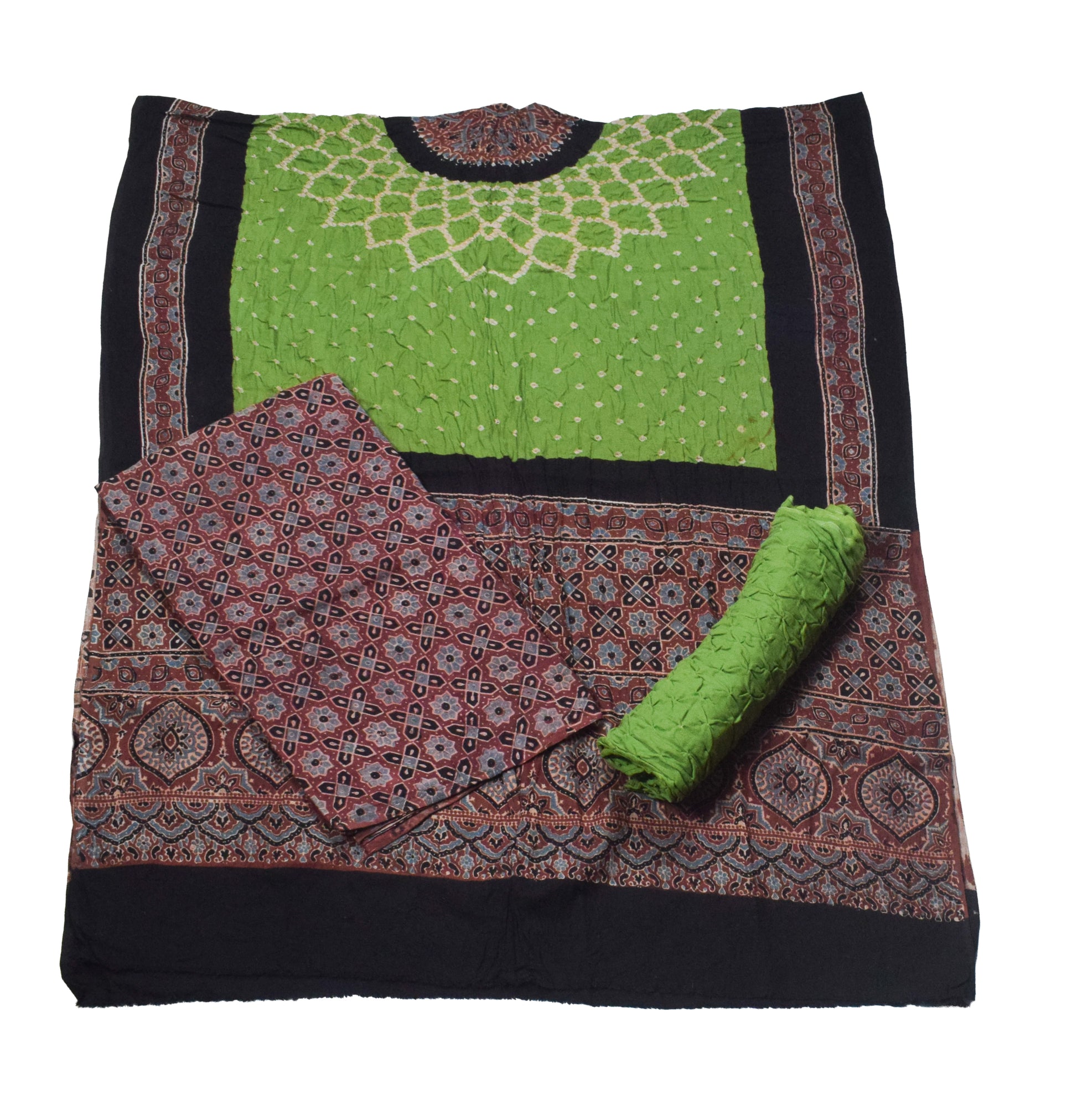 Ajrakh Satin Cotton Part Natural Dye Hand Block Print Dress Material with Bandhej Bottom and Dupatta - 2.5 Mt Top - SKU : MS24A01N