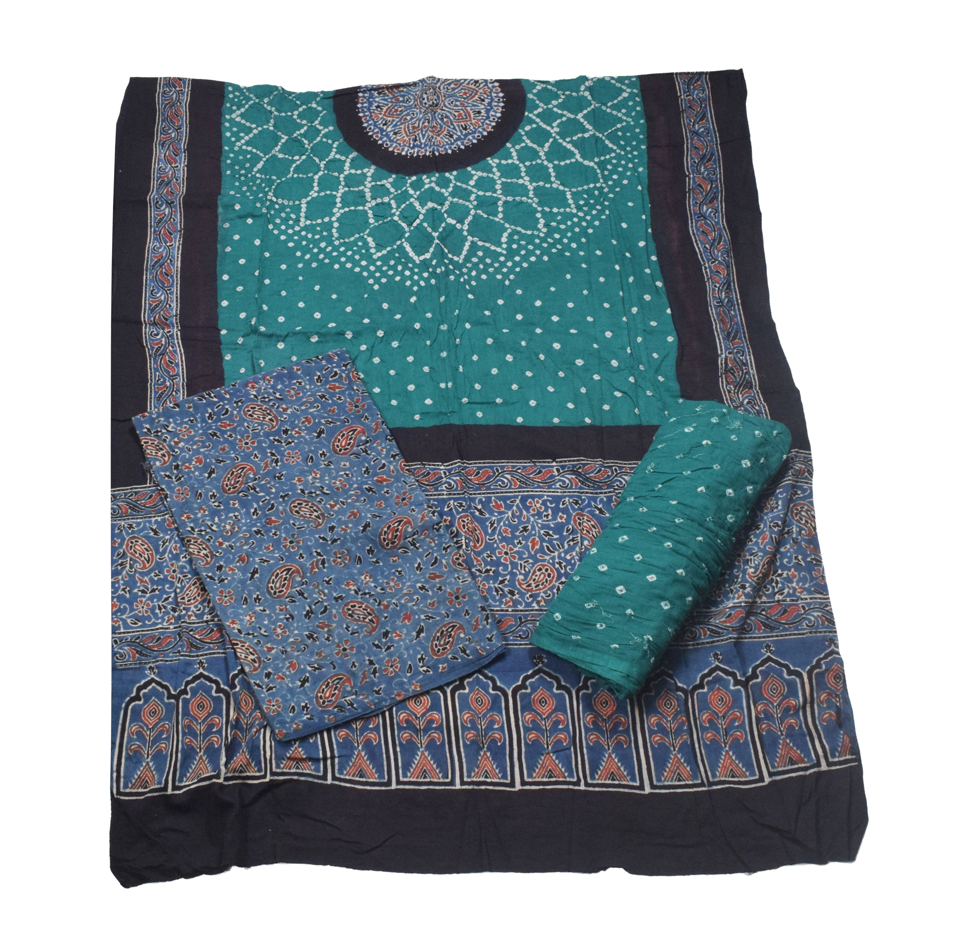 Ajrakh Satin Cotton Part Natural Dye Hand Block Print Dress Material with Bandhej Bottom and Dupatta - 2.5 Mt Top - SKU : MS17401P