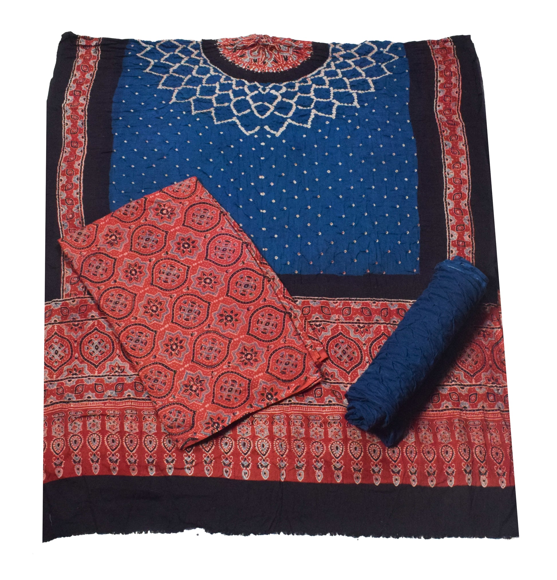 Ajrakh Satin Cotton Part Natural Dye Hand Block Print Dress Material with Bandhej Bottom and Dupatta - 2.5 Mt Top - SKU : MS24A01L