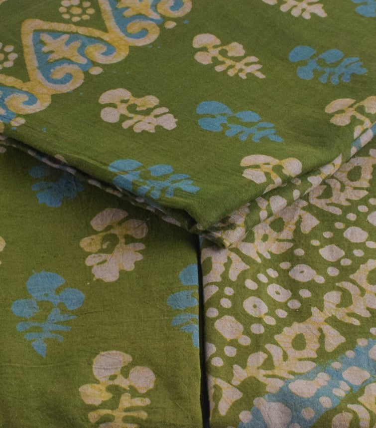* UNIQUE FEATURE : Multi step Multi Colour Wax Batix Printing through repeated process of applying Wax Resist, Hand Printing, Dying, Washing, Boiling to remove wax, repeated for each colour.