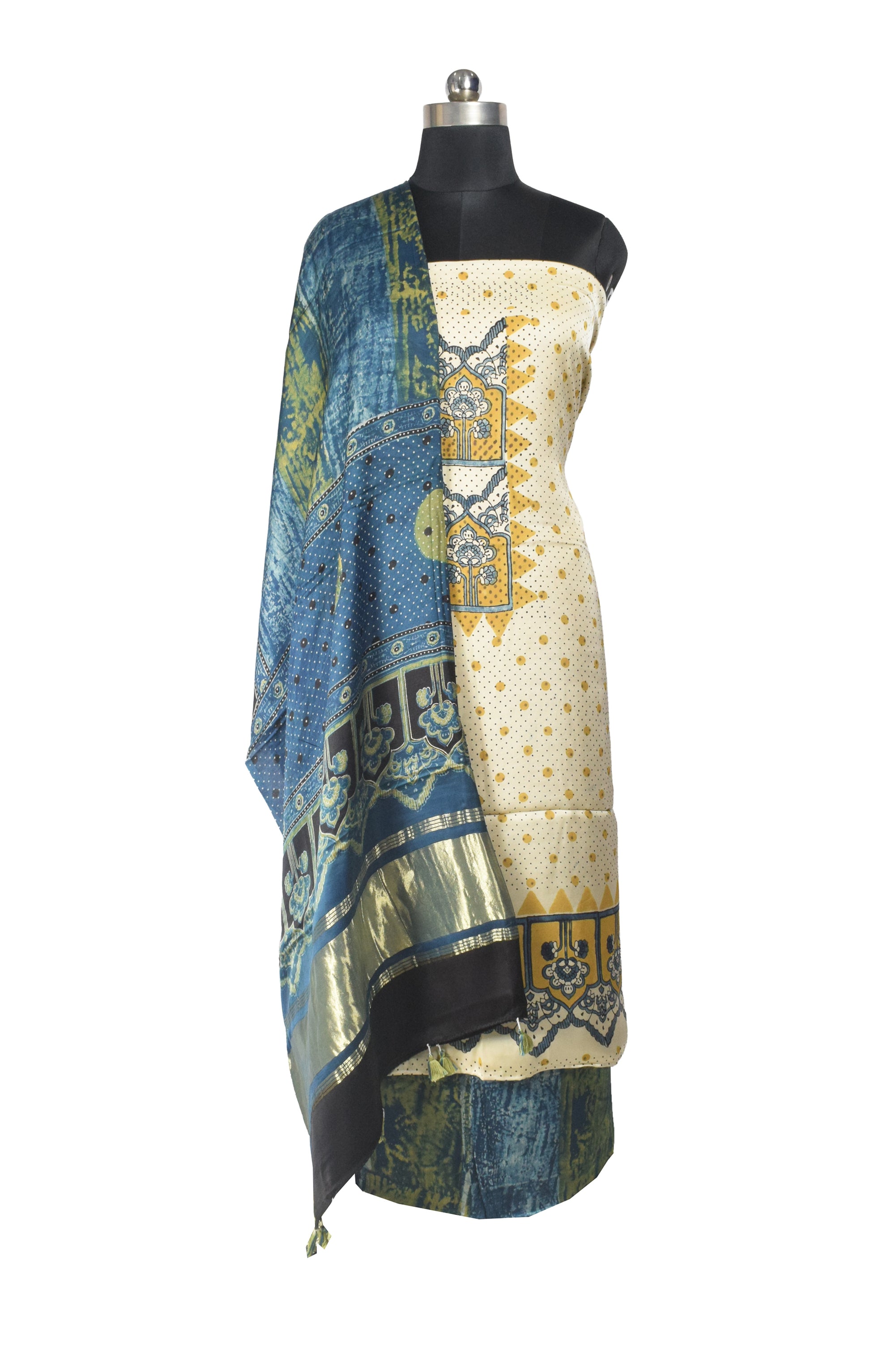 Ajrakh Modal Silk Natural Dye Hand Block Print Dress Material with Golden Border Dupatta - with Tassels - 2.5 Mt Top - SKU : AI27A03K