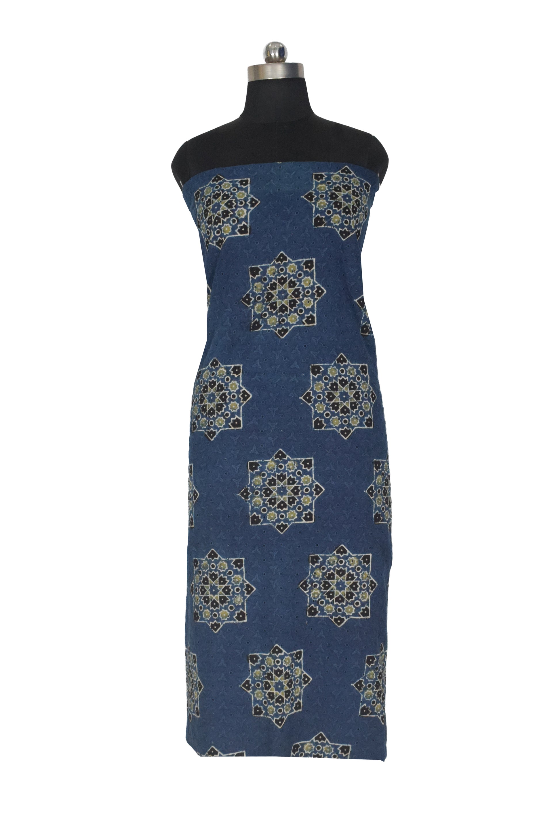 Ajrakh Cotton Natural Dye Hakoba Design Hand Block Print Unstitched Kurta Fabric Mtr Length 2.5 Mtr Length - SKU : MK12901G