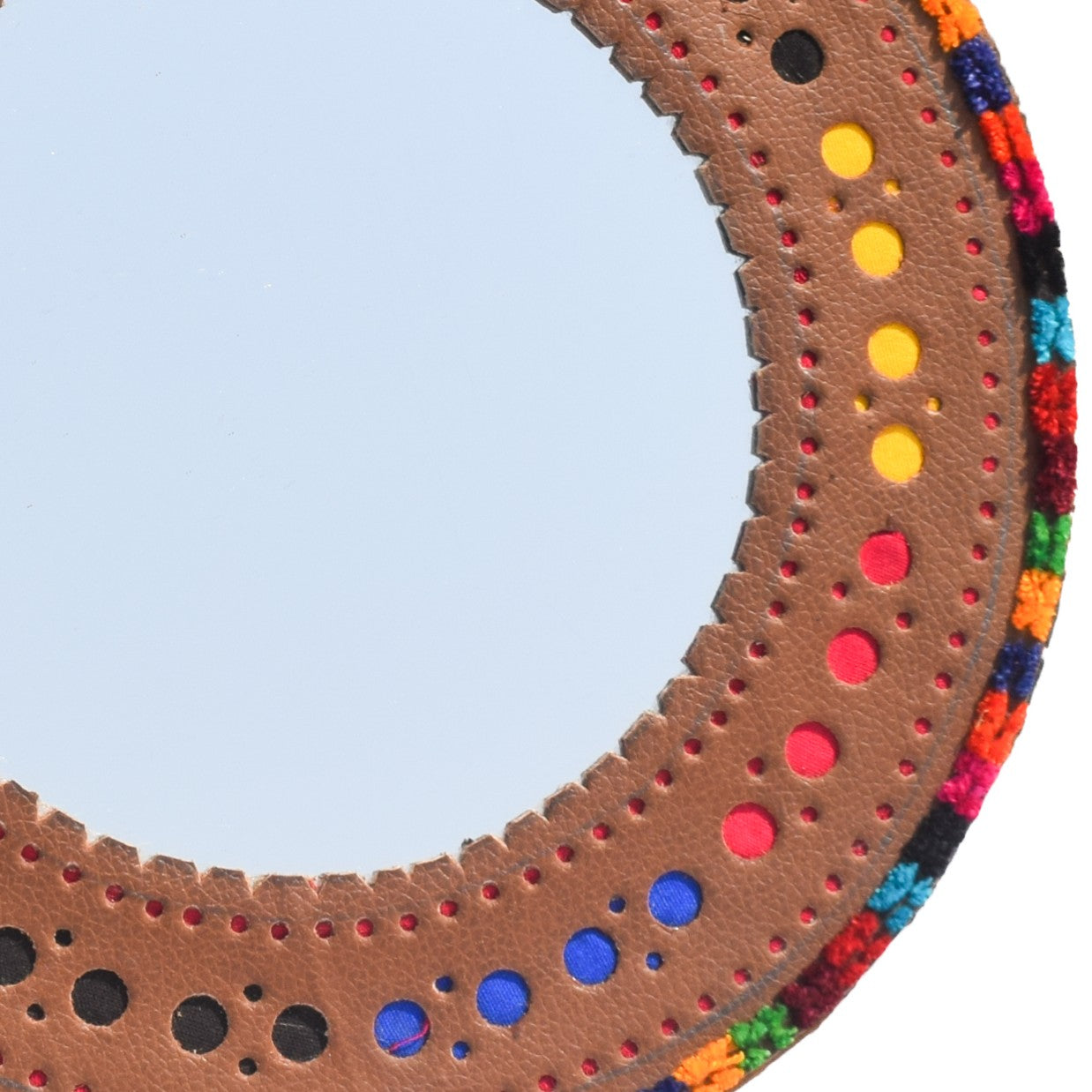 * UNIQUE FEATURE : A Motif is skillfully created with hand with Leather Craft Punch tools on leather. Leather is fixed on background of vivid coloured fabrics as its fixes mirror on board