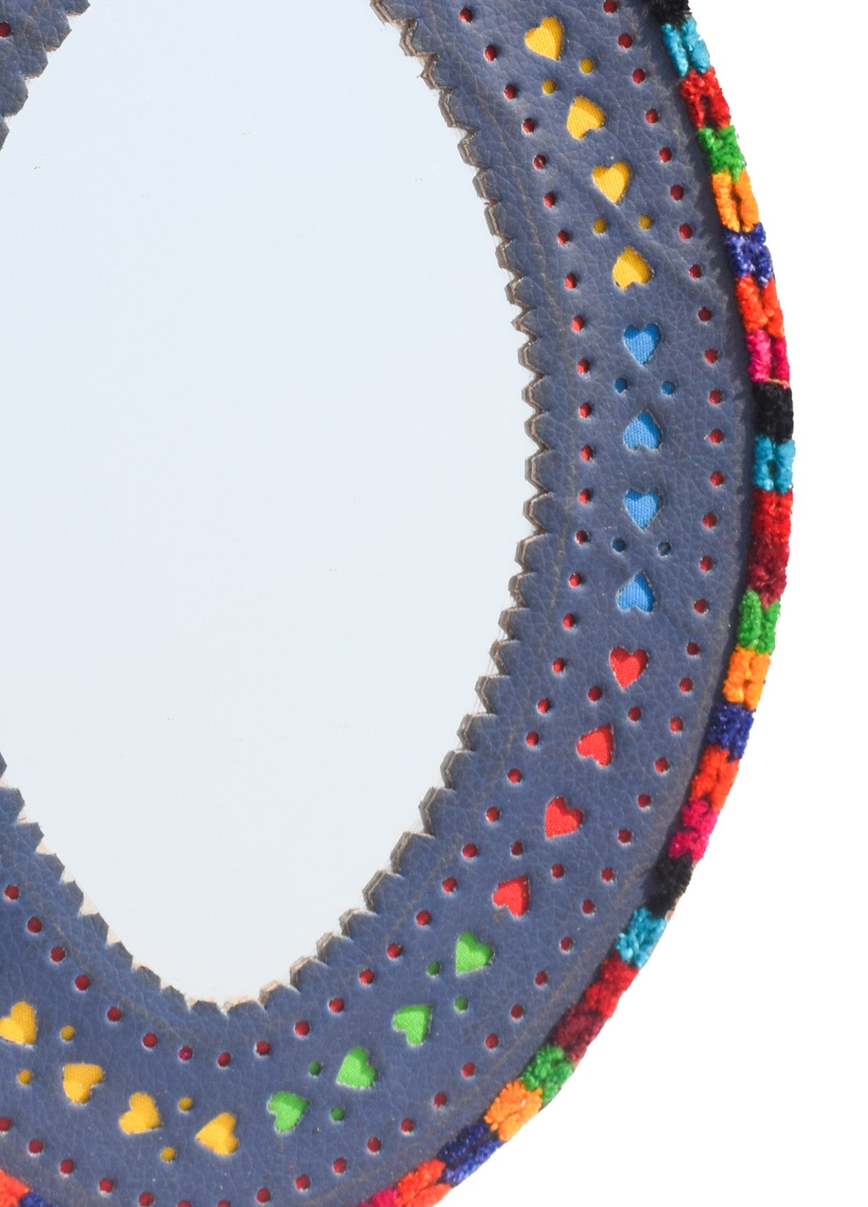 * UNIQUE FEATURE : A Motif is skillfully created with hand with Leather Craft Punch tools on leather. Leather is fixed on background of vivid coloured fabrics as its fixes mirror on board