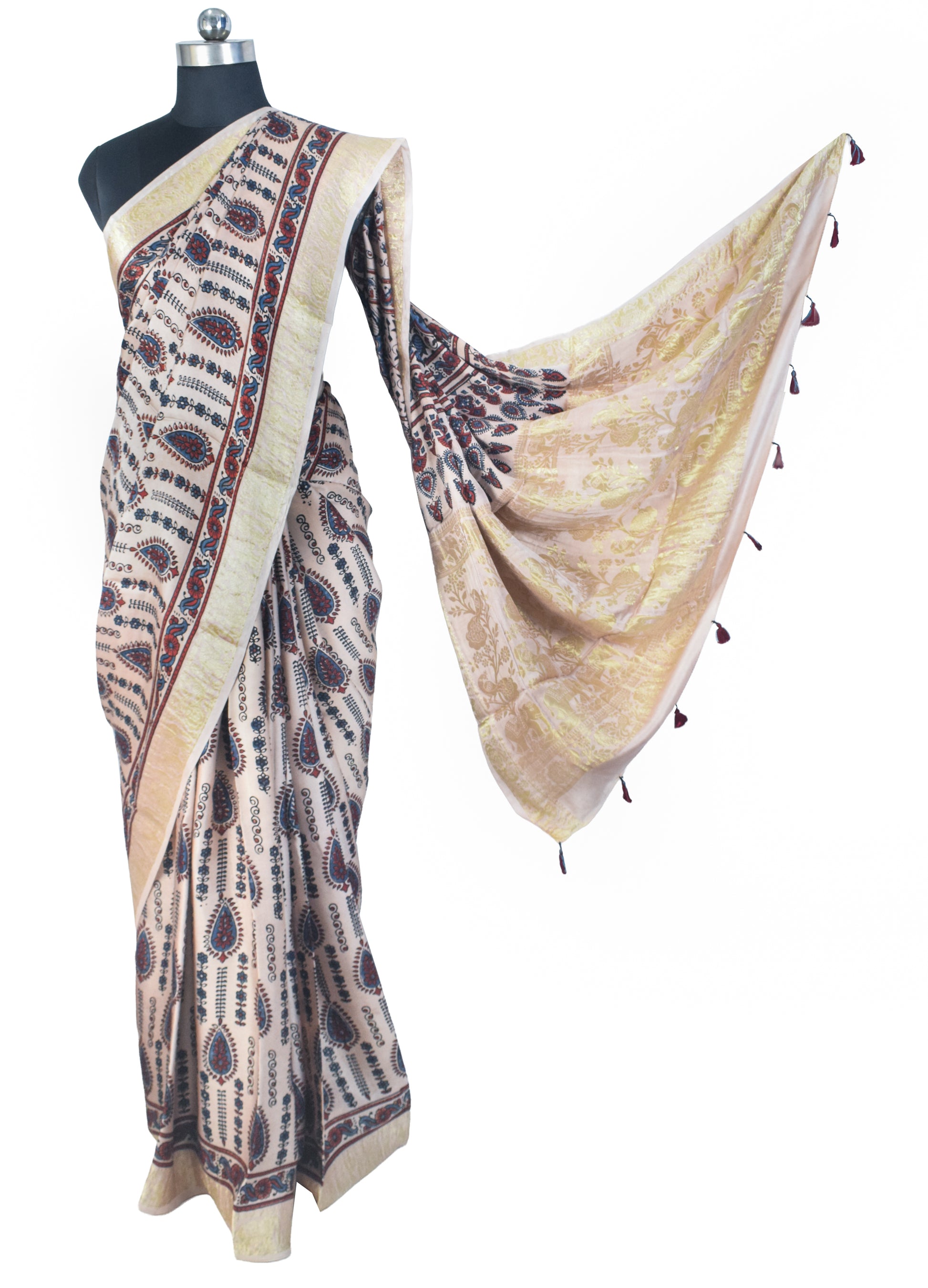 * UNIQUE FEATURE : BLOUSE PIECE Included as Additional Length of 1 Mtrs- Hand Printed with Natural Dyes made out of Organic and In-Organic Natural substances like, Iron Rust, Indigo, Turmeric, Alizarin etc Printed. Skin and Eco Friendly