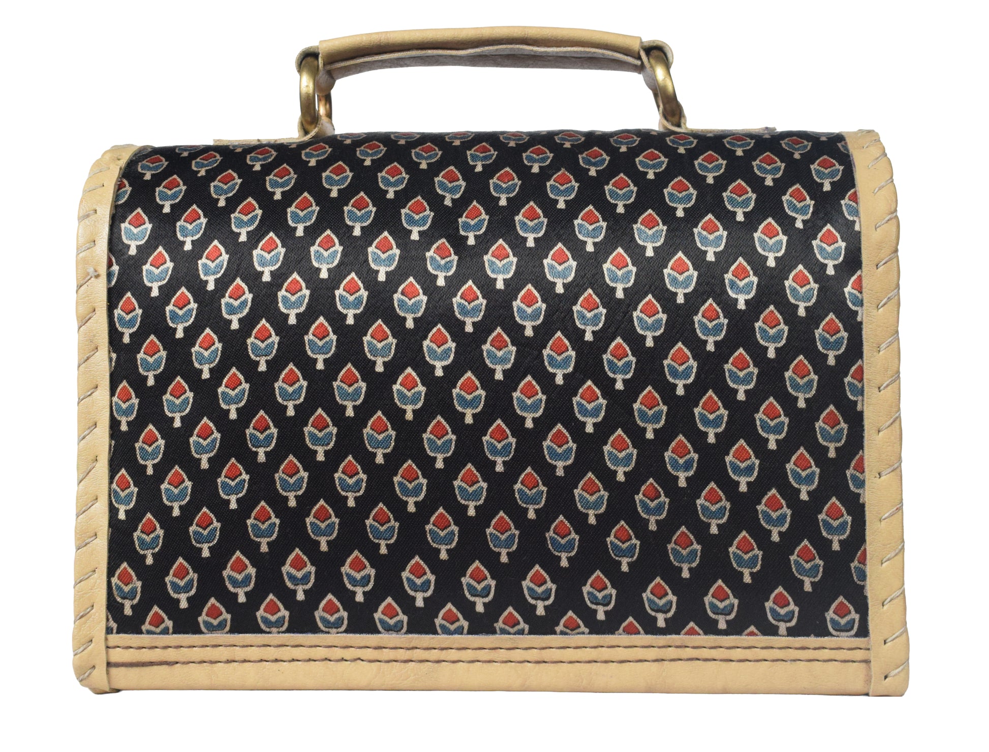 * UNIQUE FEATURE : Rexine Handle Bag with Strap has Natural Dye Hand Block Print Mashru Silk and Antique Aahir Hand Embroidery Sides. Unique Blend of Tradition and Style