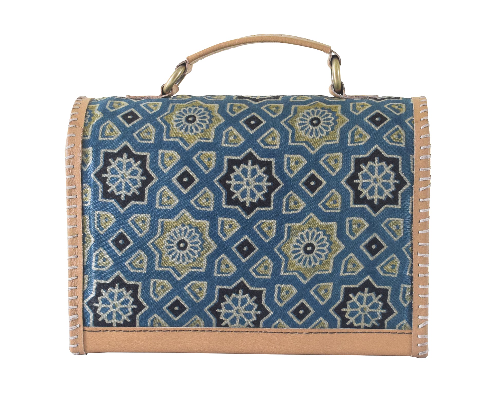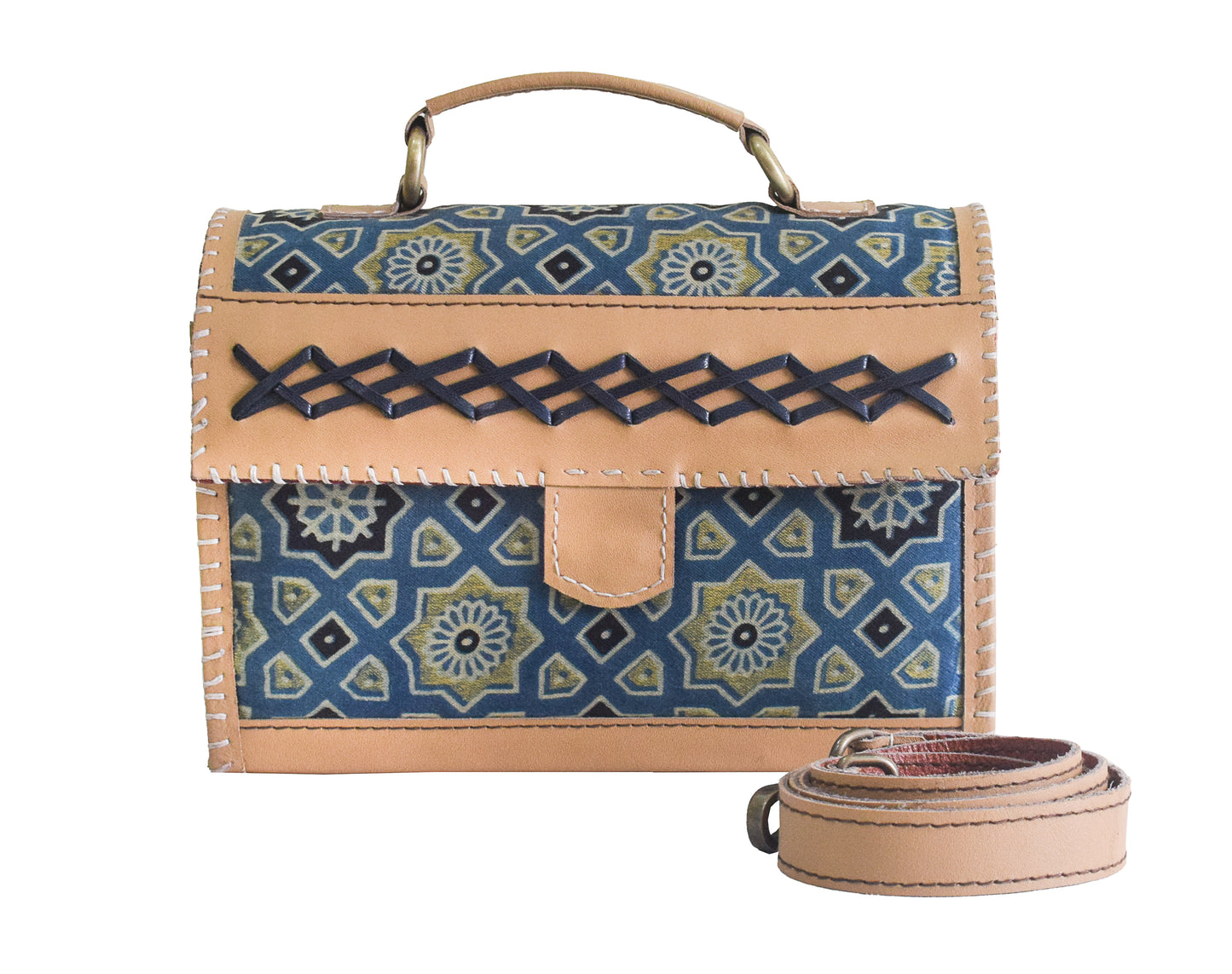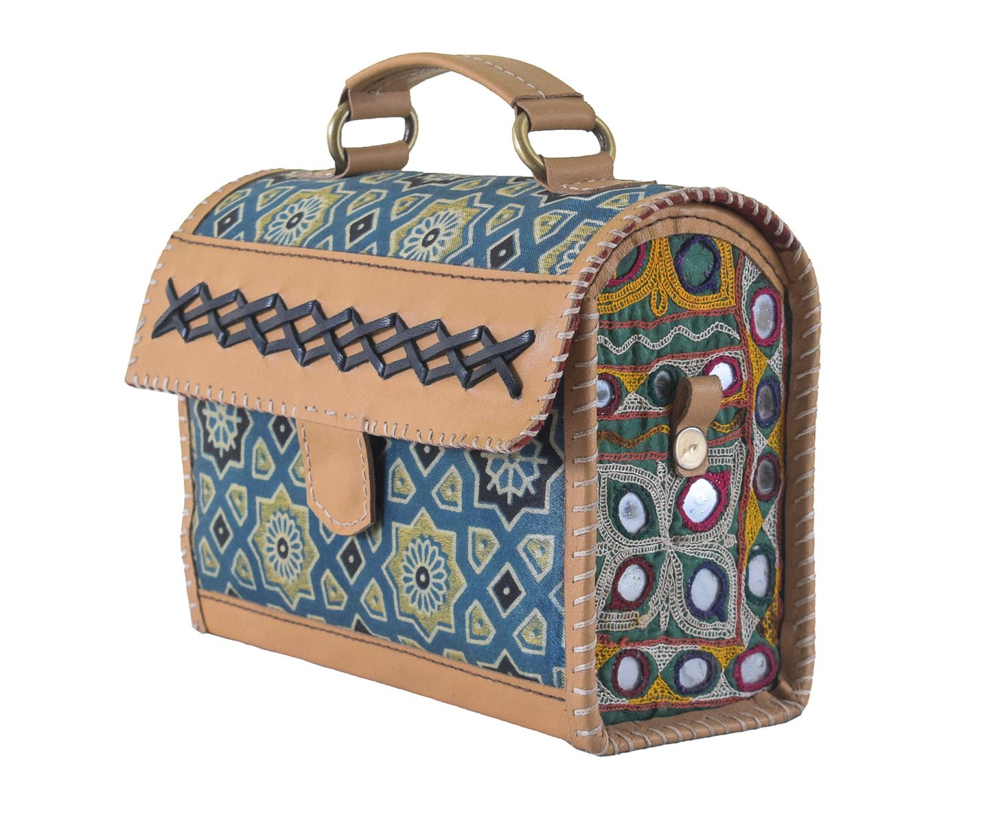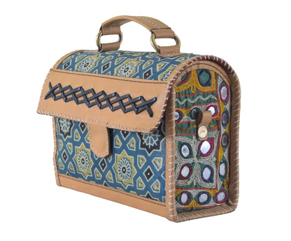 * UNIQUE FEATURE : Pure Leather Handle Bag with Strap has Natural Dye Hand Block Print Mashru Silk and Antique Aahir Hand Embroidery Sides. Unique Blend of Tradition and Style
