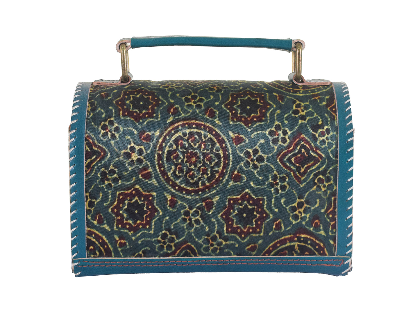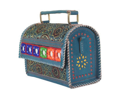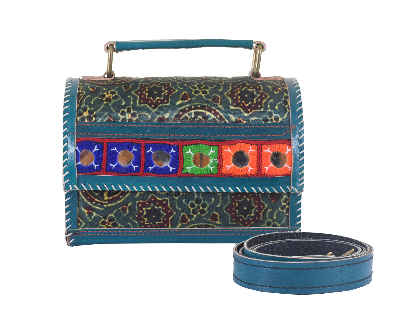 Ajrakh Pure Leather Handcrafted Leather Craft Punch Work Sling Bag Mirror Work - 14 cms Height x - SKU : AB21303B
