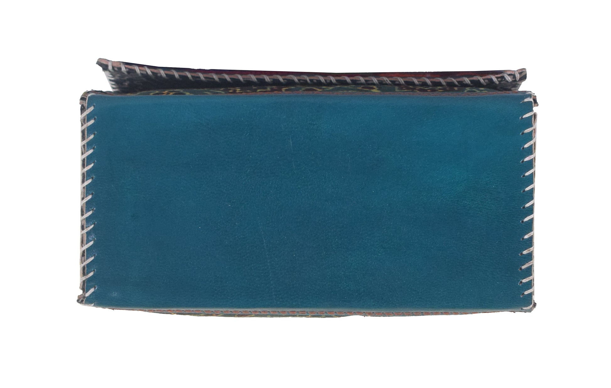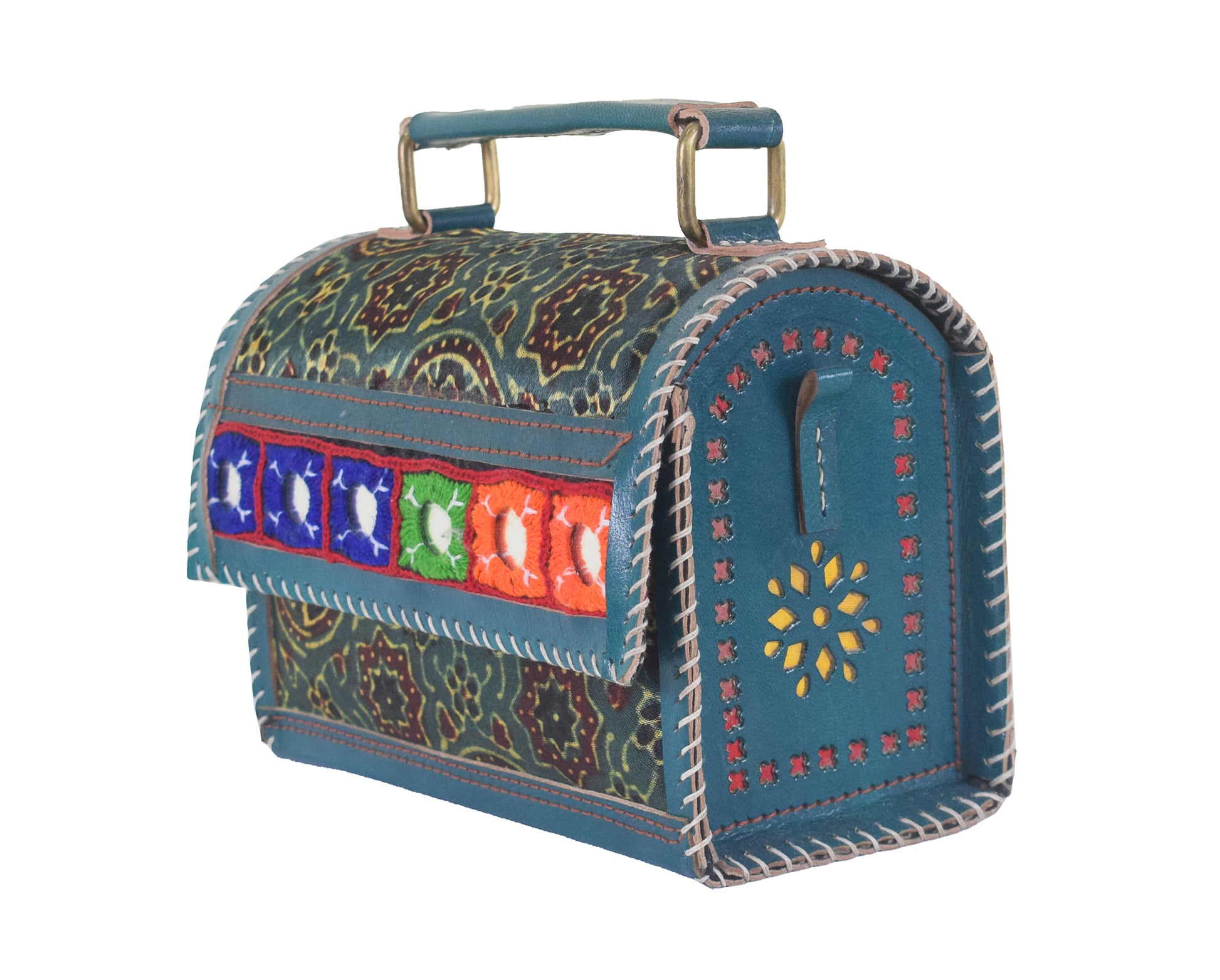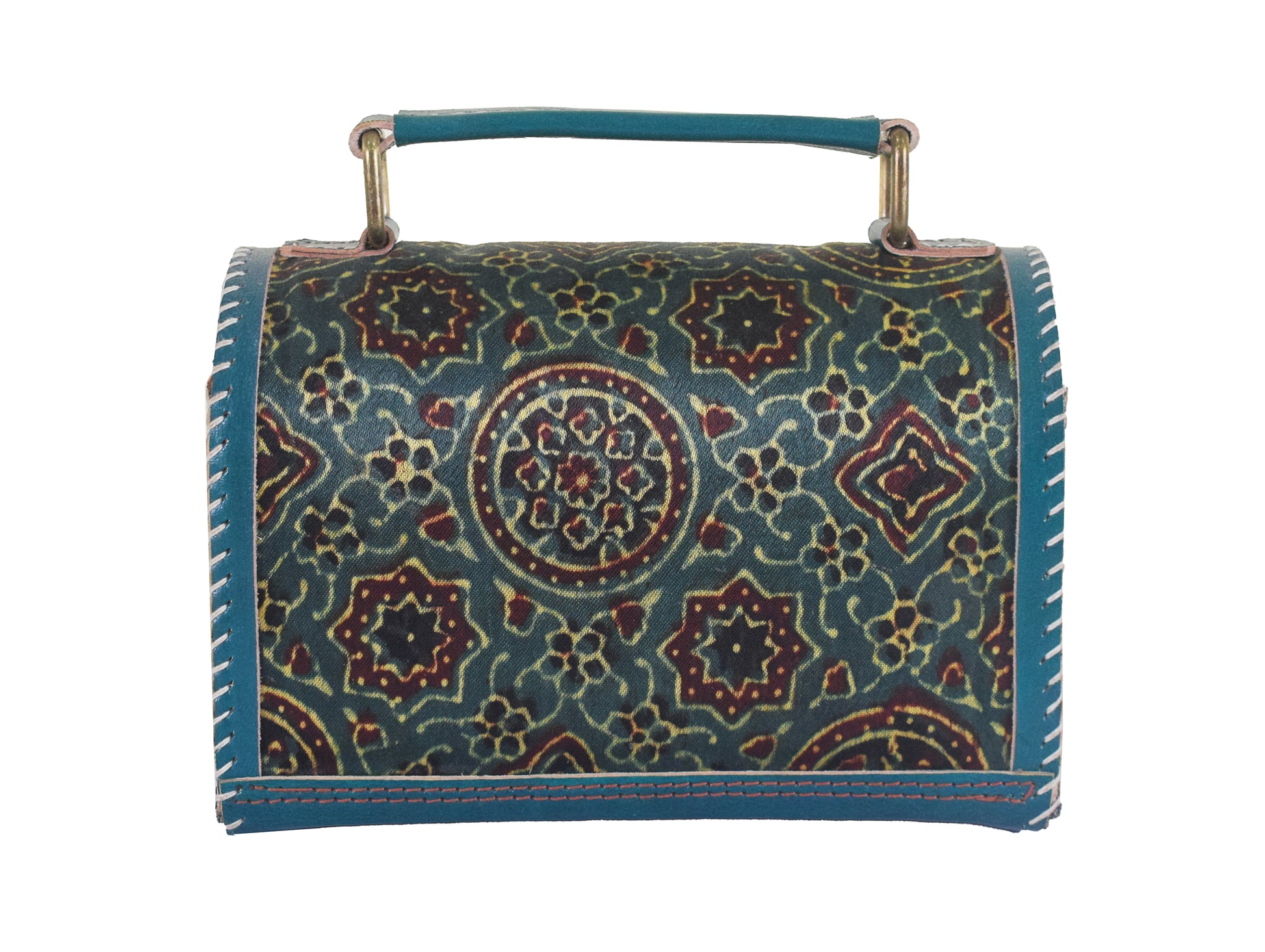 * UNIQUE FEATURE : Pure Leather Handle Bag with Strap has Natural Dye Hand Block Print Mashru Silk and Antique Aahir Hand Embroidery Sides. Unique Blend of Tradition and Style