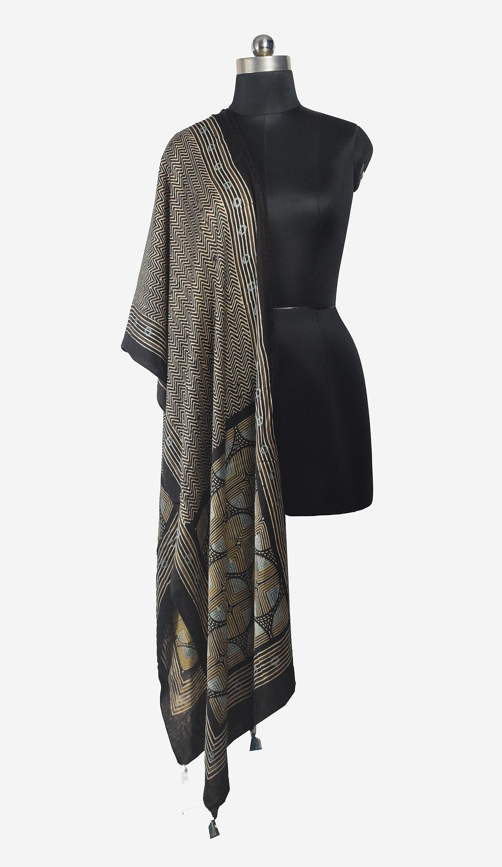 Ajrakh Modal Silk Natural Dye Hand Block Print Stole With Tassels - 2 Mtr Length - SKU : AI26901A