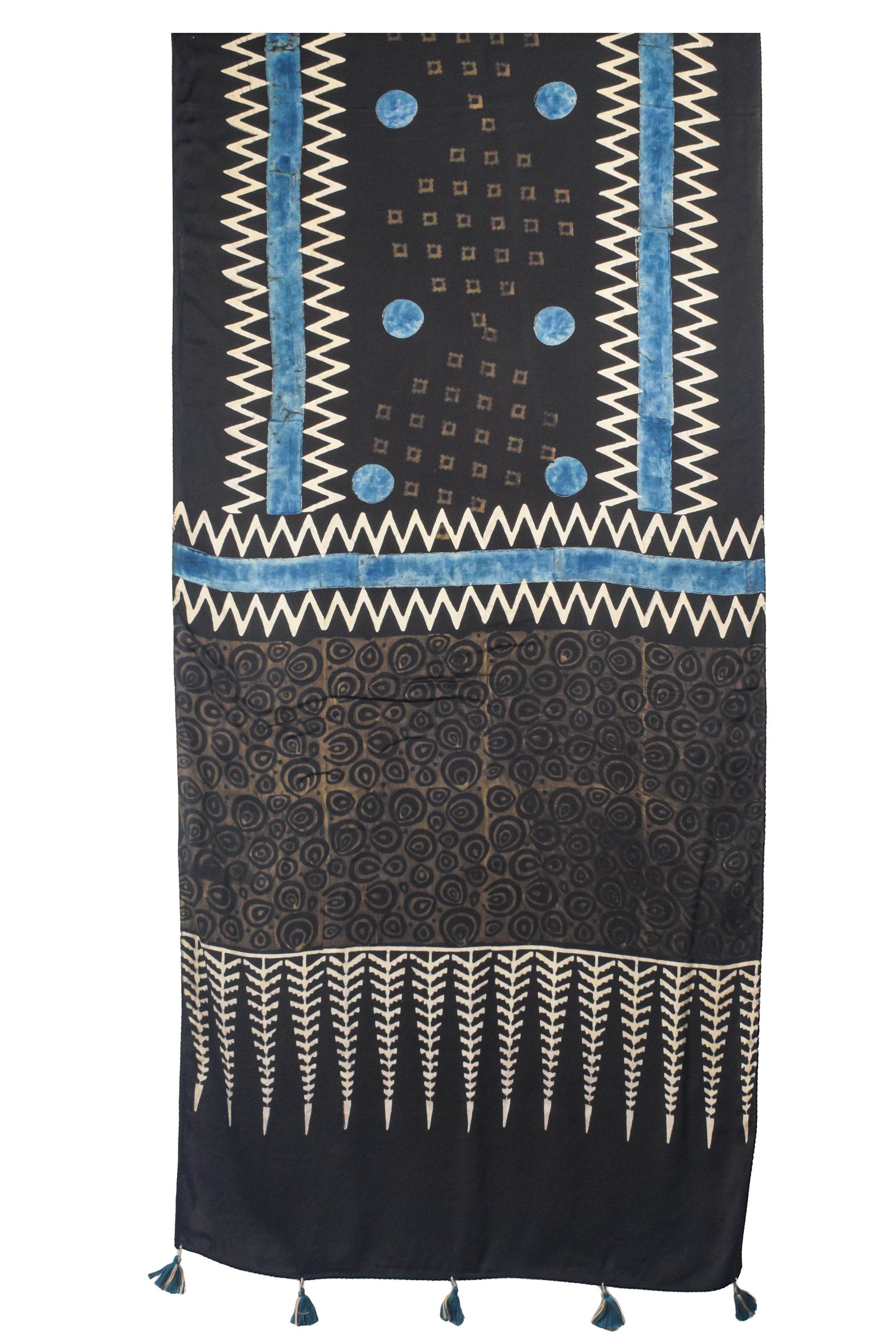 Ajrakh Modal Silk Natural Dye Hand Block Print Stole With Tassels - 2 Mtr Length - SKU : AI26901D