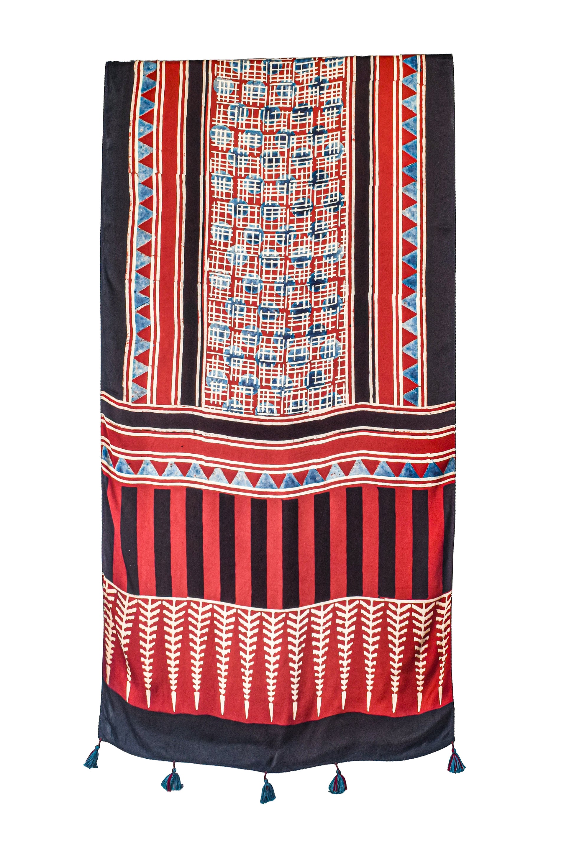 Ajrakh Modal Silk Natural Dye Hand Block Print Stole With Tassels - 2 Mtr Length - SKU : AI2690AD