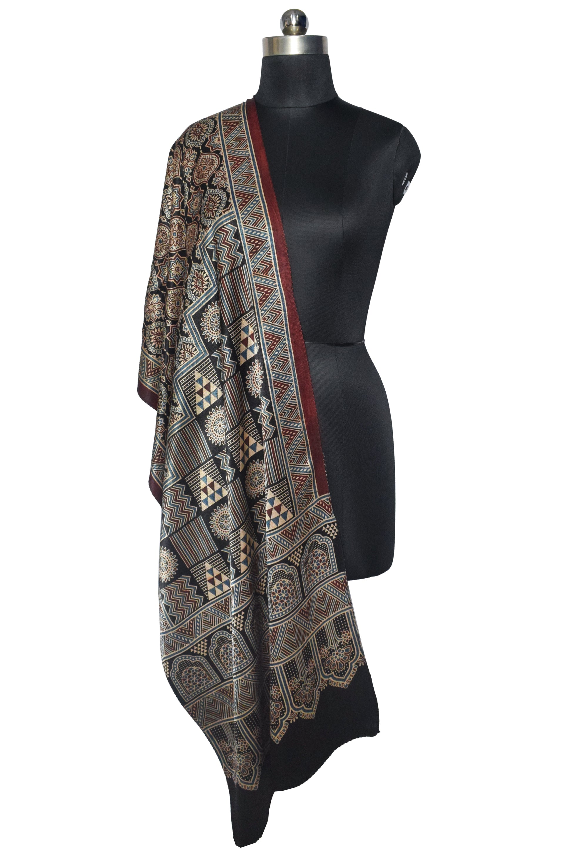 Ajrakh Mashru Silk Natural Dye Screen Print Hand Printed Stole - 2.1 Mtr Length - SKU : JH25601O