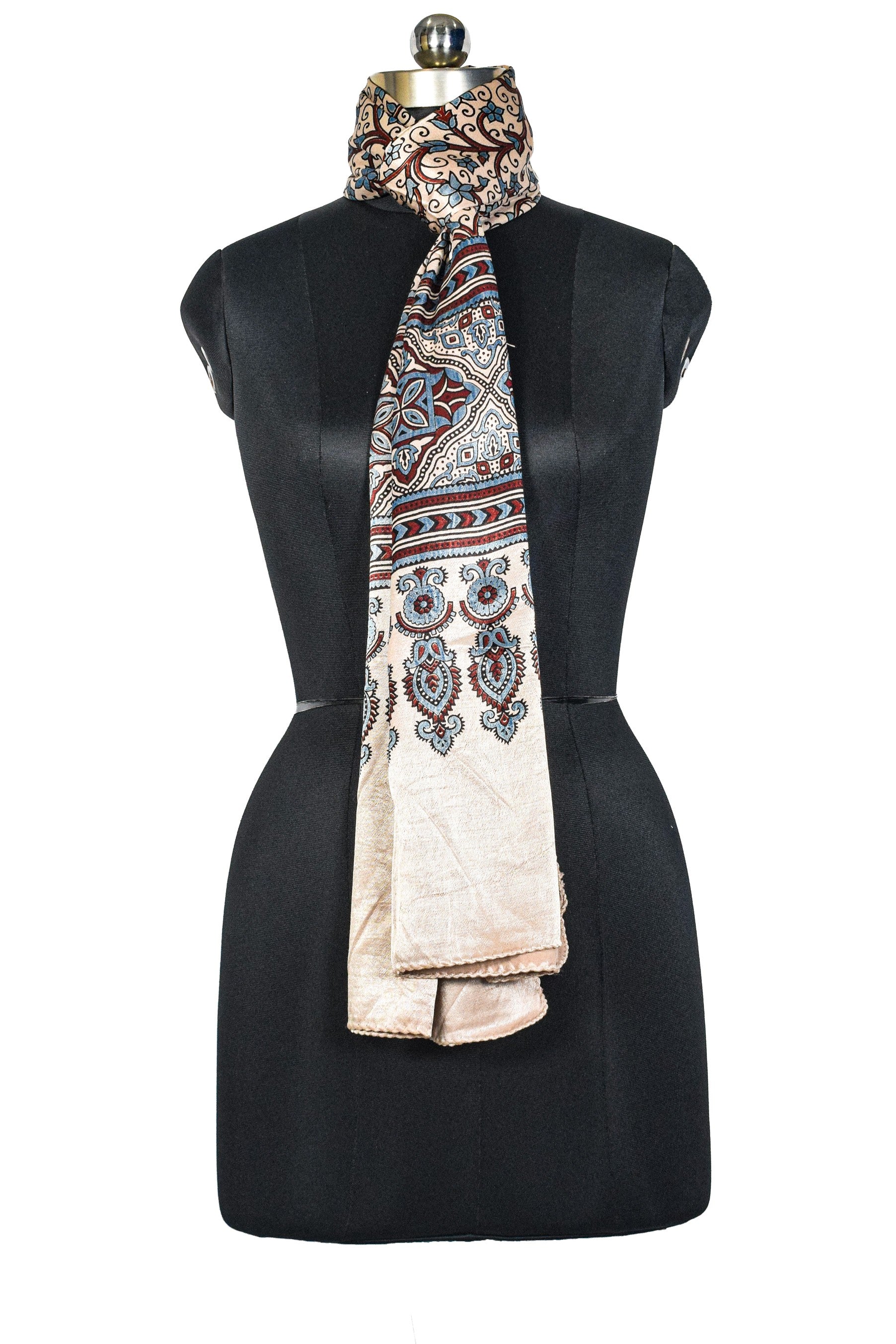 Ajrakh Mashru Silk Natural Dye Three Colour Print ( 3 Kam ) Screen Print Hand Printed Stole - 2.1 Mtr Length - SKU : JH02C01J