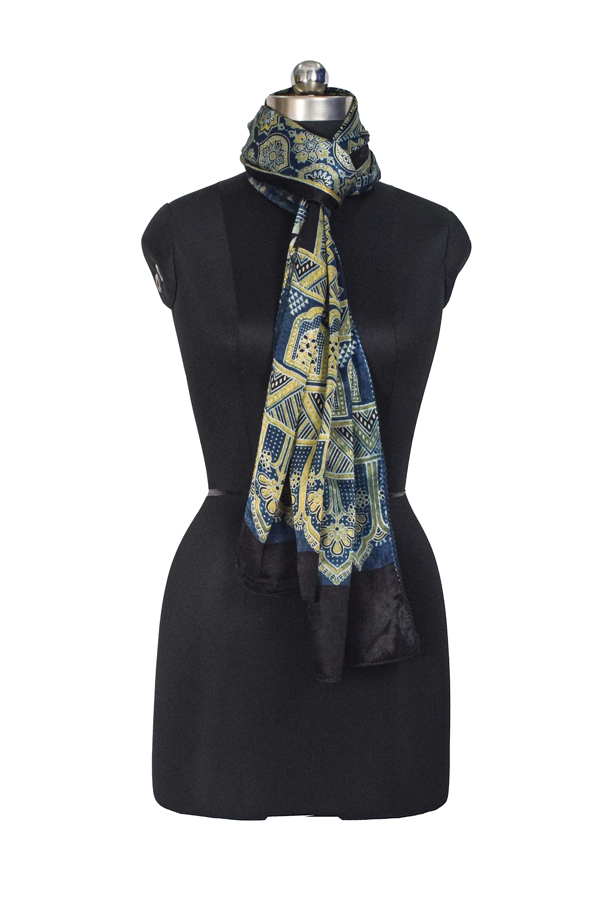 Ajrakh Mashru Silk Natural Dye Three Colour Print ( 3 Kam ) Screen Print Hand Printed Stole - 2.1 Mtr Length - SKU : JH03101B