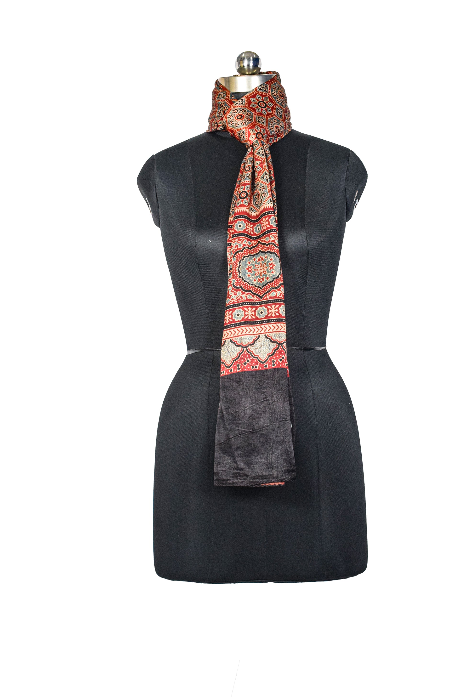 Ajrakh Mashru Silk Natural Dye Three Colour Print ( 3 Kam ) Screen Print Hand Printed Stole - 2.1 Mtr Length - SKU : JH02C01N