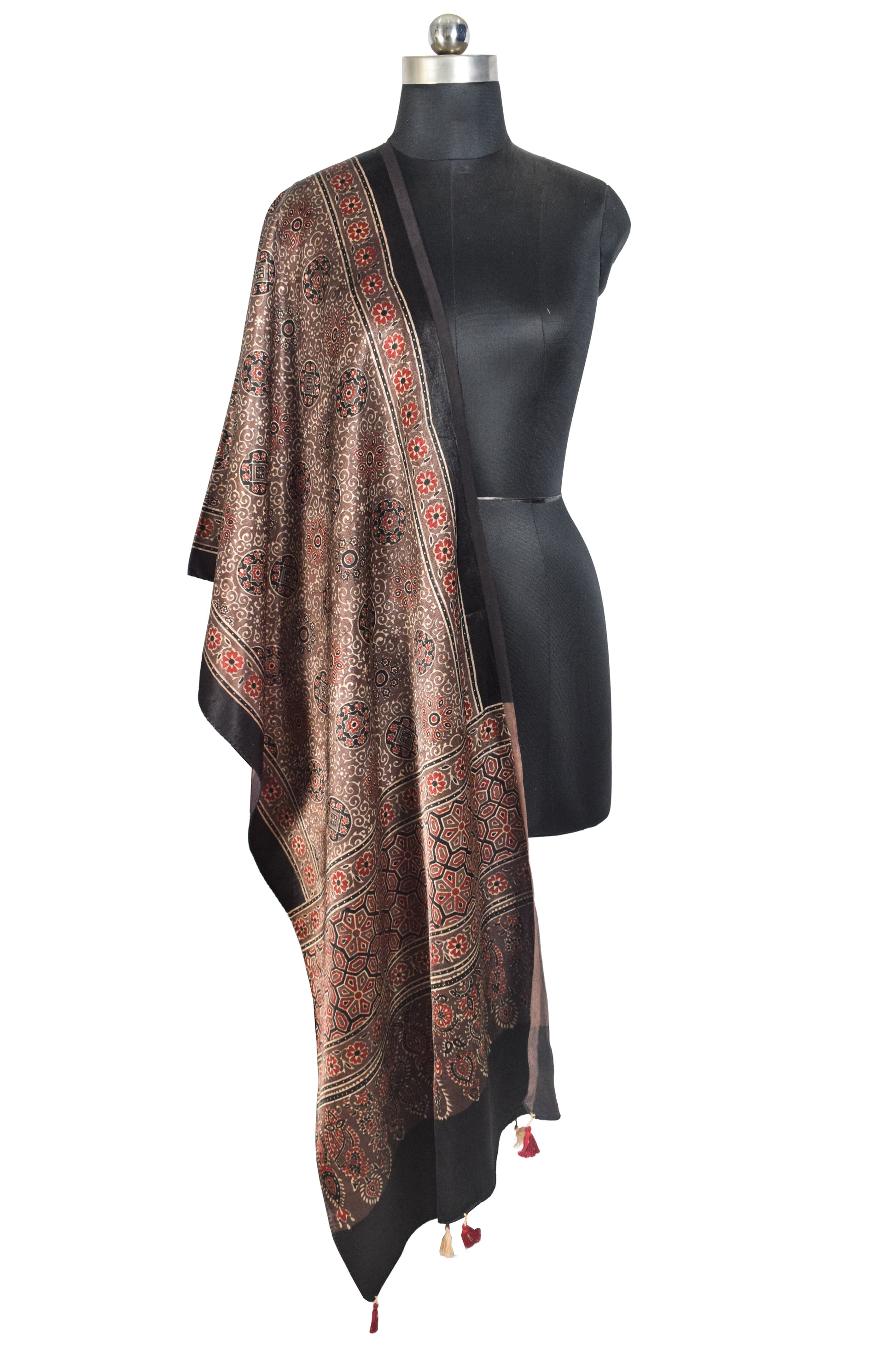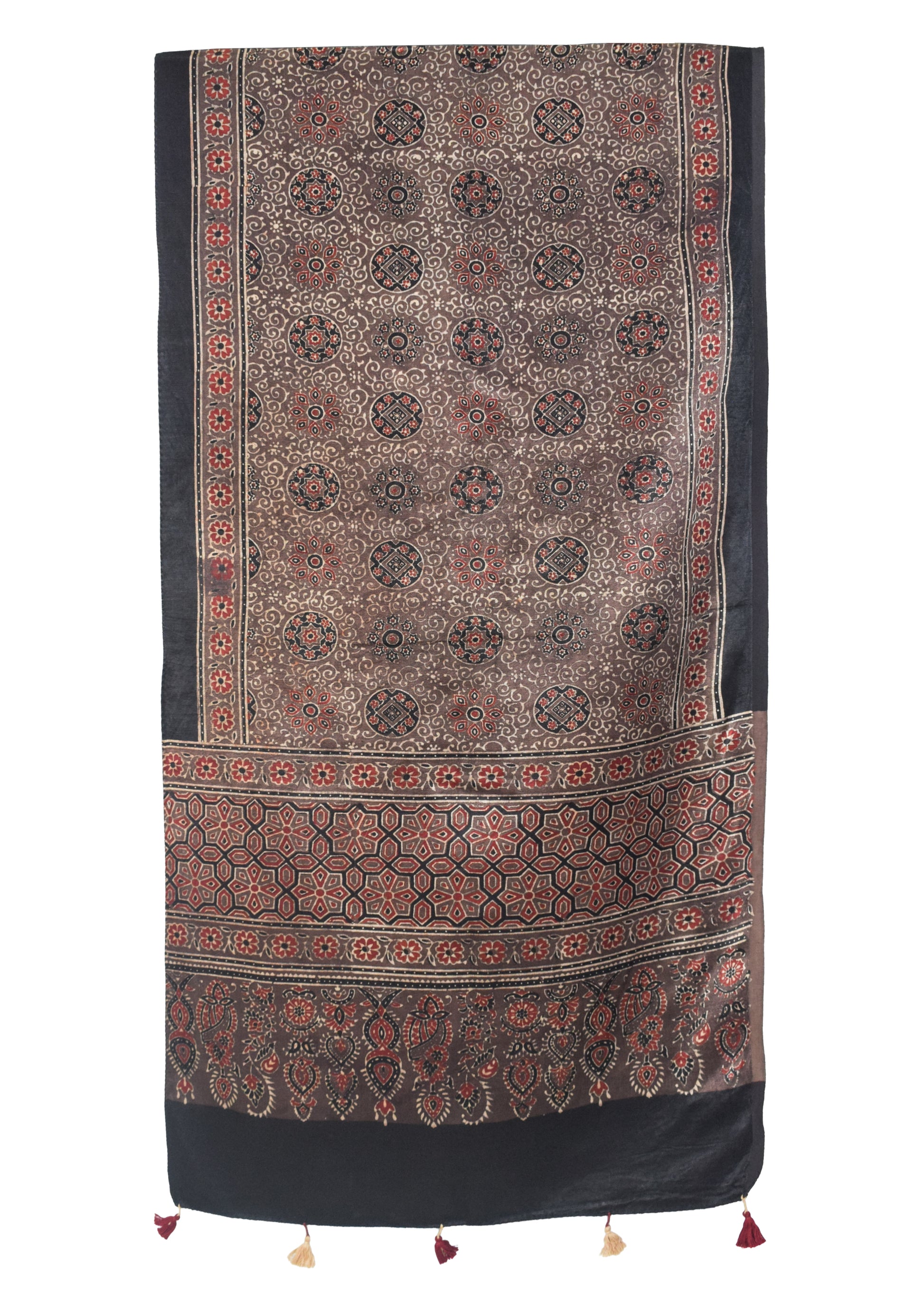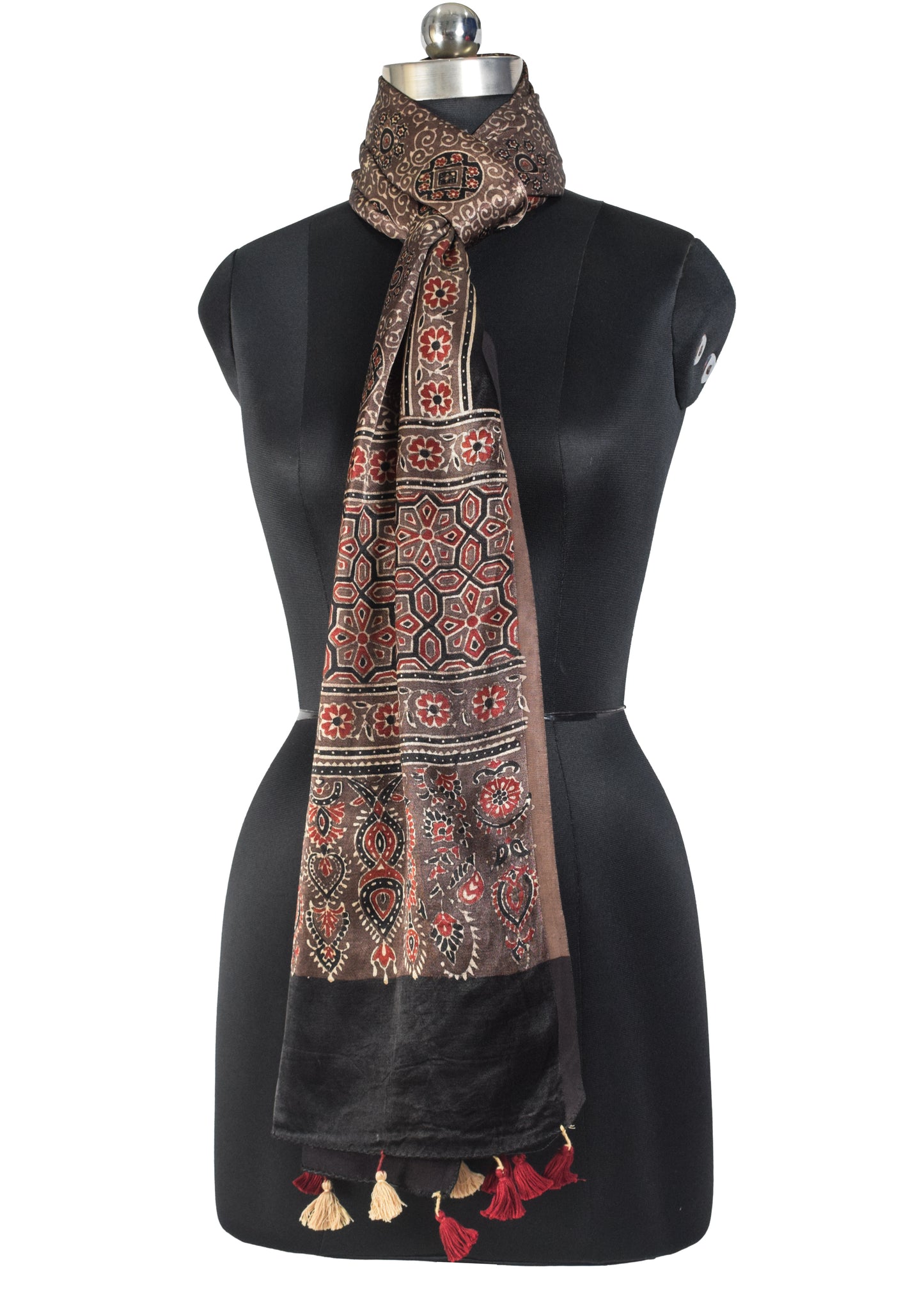 Ajrakh Mashru Silk Natural Dye Hand Block Print Stole With Tassels - 2 Mtr Length - SKU : EK0460AG