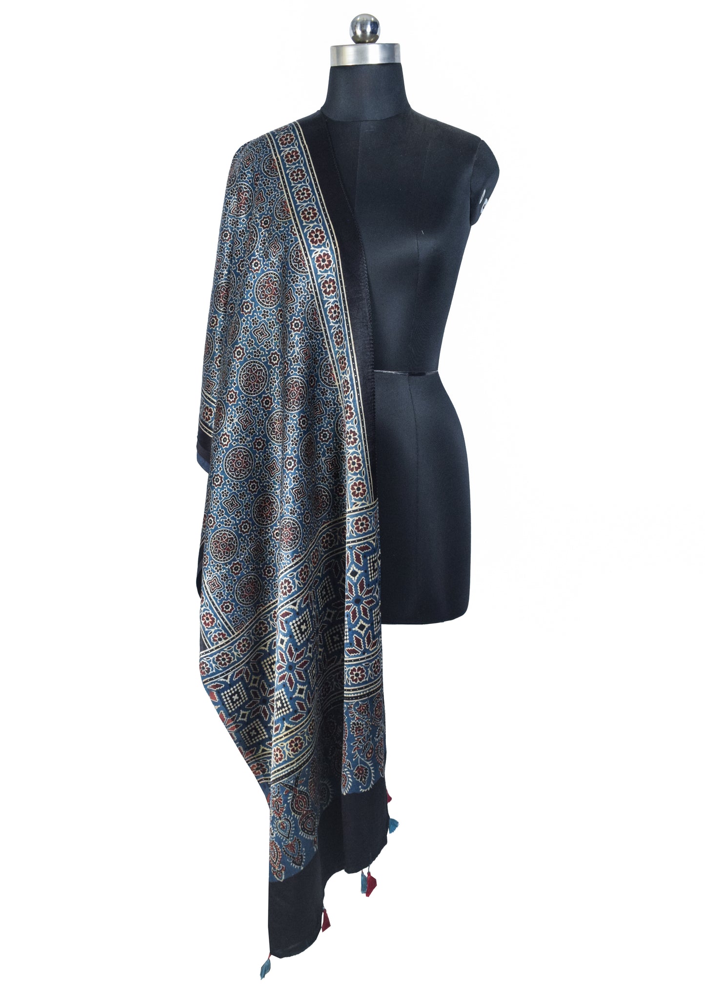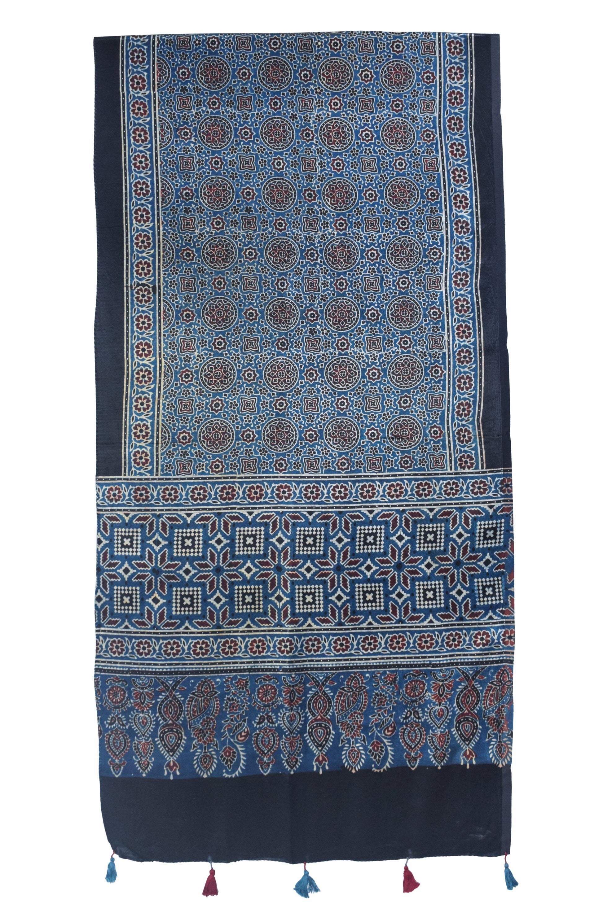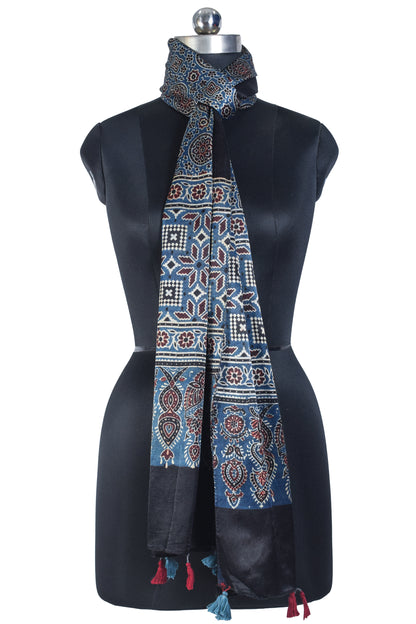 Ajrakh Mashru Silk Natural Dye Hand Block Print Stole With Tassels - 2 Mtr Length - SKU : EK04601L