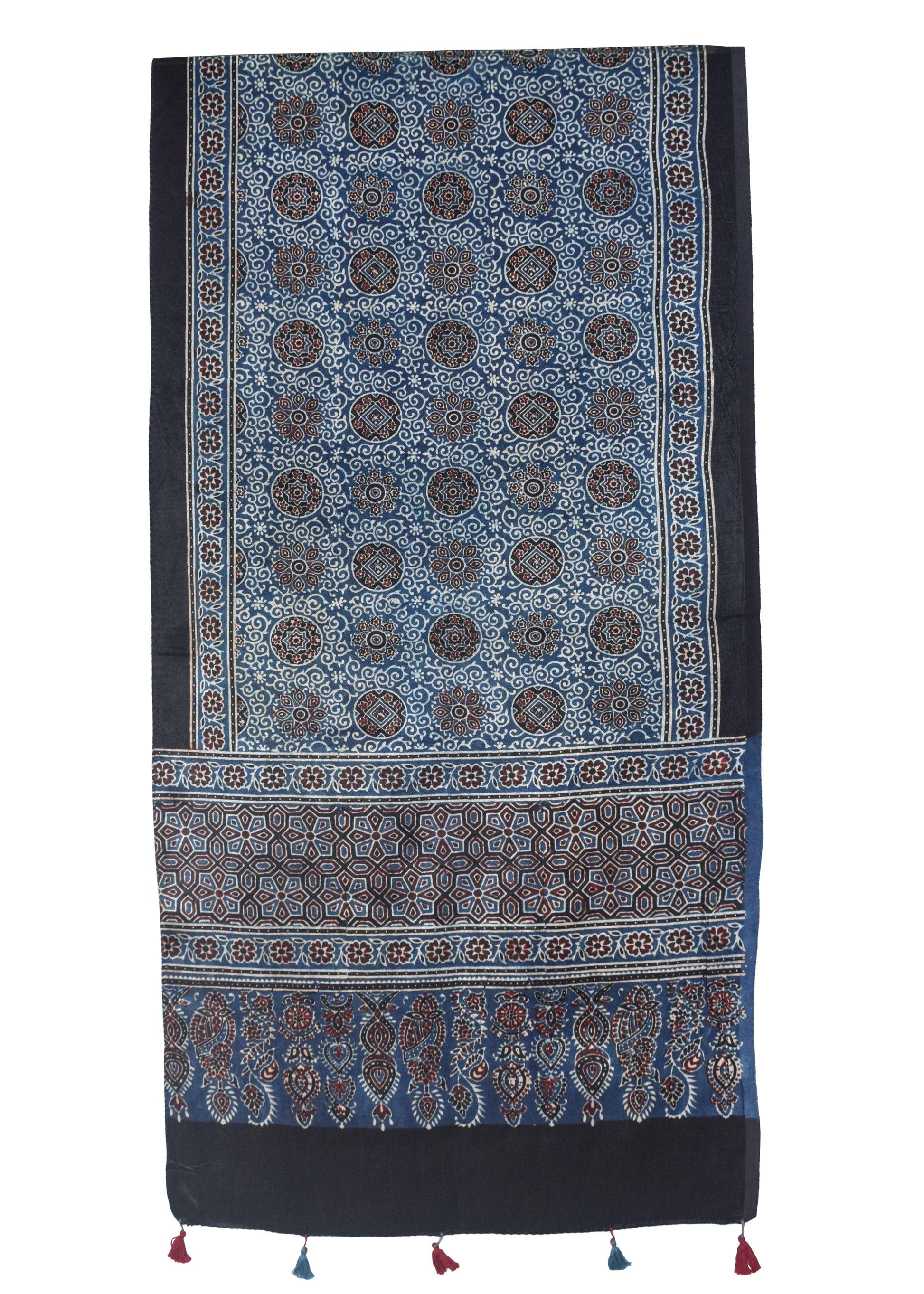 Ajrakh Mashru Silk Natural Dye Hand Block Print Stole With Tassels - 2 Mtr Length - SKU : EK0460AE