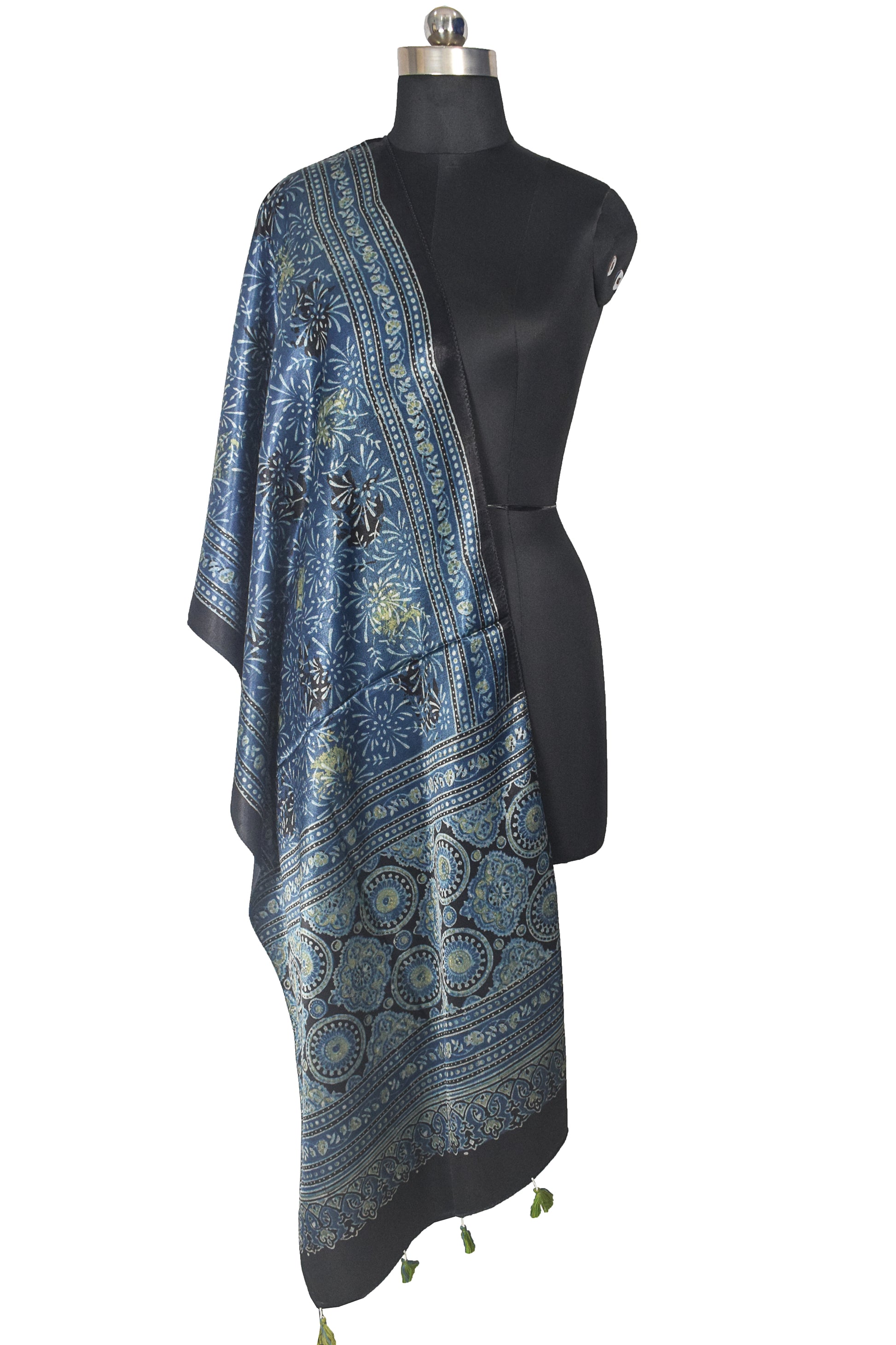 Ajrakh Mashru Silk Natural Dye Hand Block Print Stole With Tassels - 2 Mtr Length - SKU : AI21702M