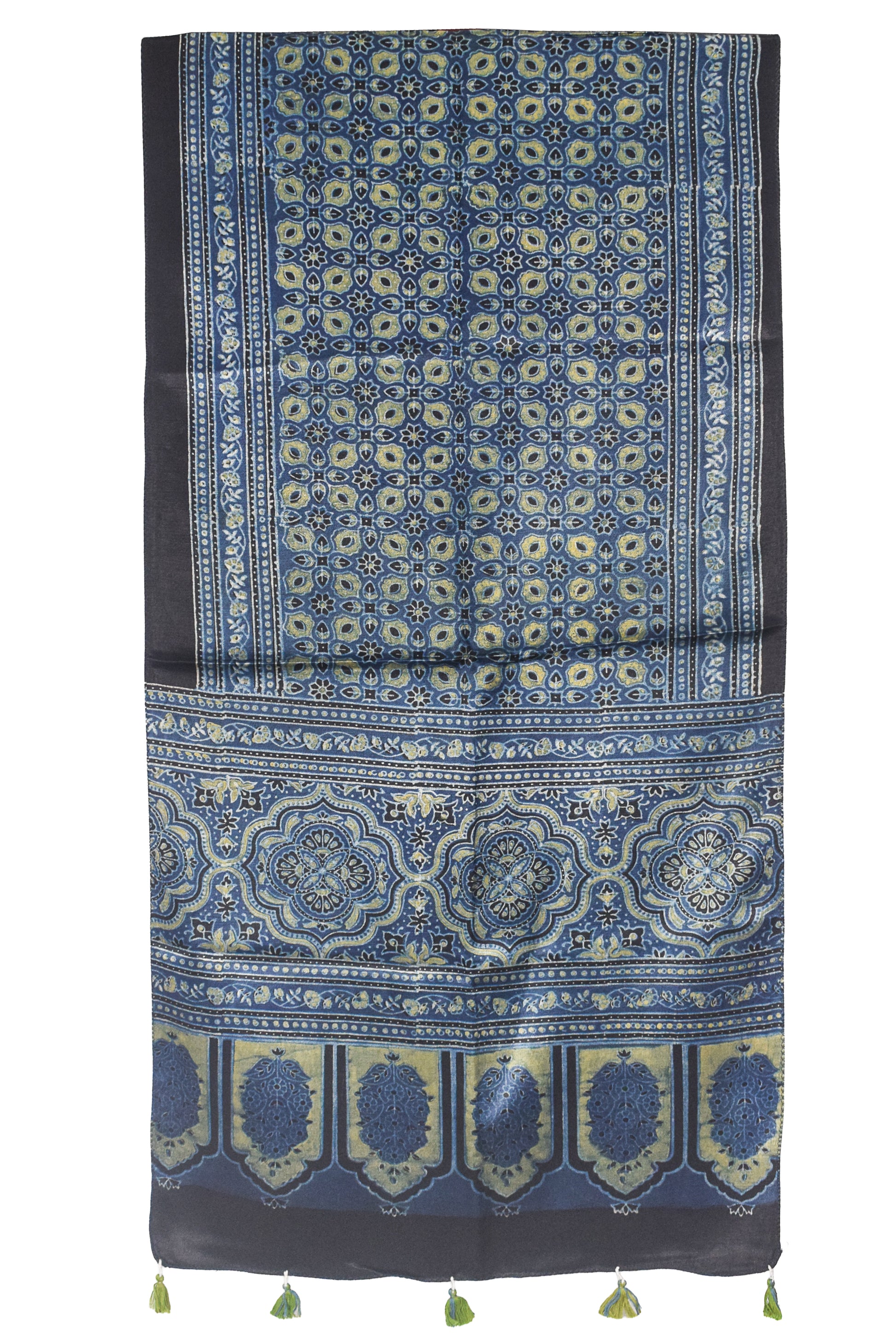 Ajrakh Mashru Silk Natural Dye Hand Block Print Stole With Tassels - 2 Mtr Length - SKU : AI21702Q