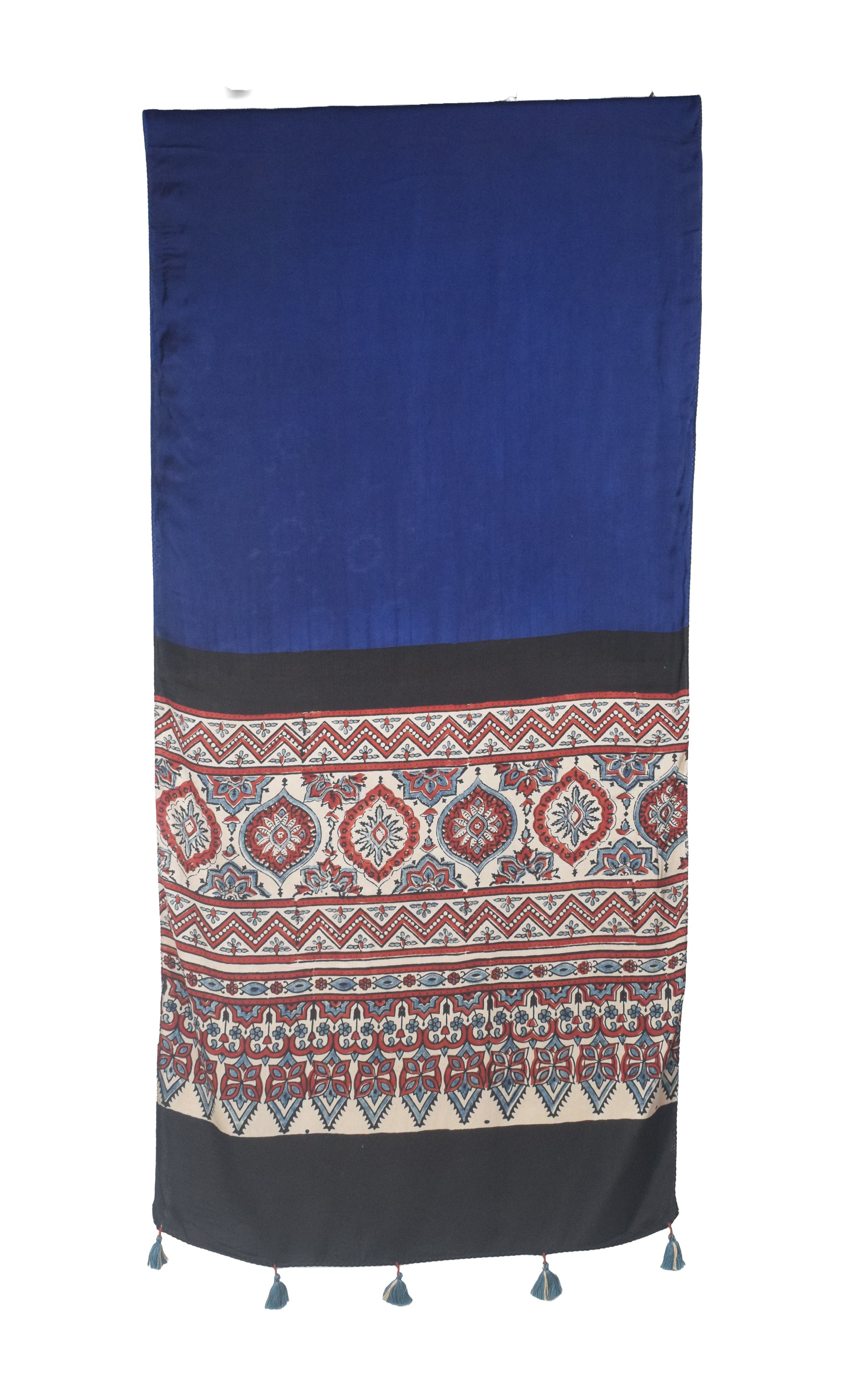 Ajrakh Modal Silk Part Natural Dye Half Plain Dyeing Hand Block Print Stole With Tassels - 2.1 Mtr Length - SKU : AI26902G