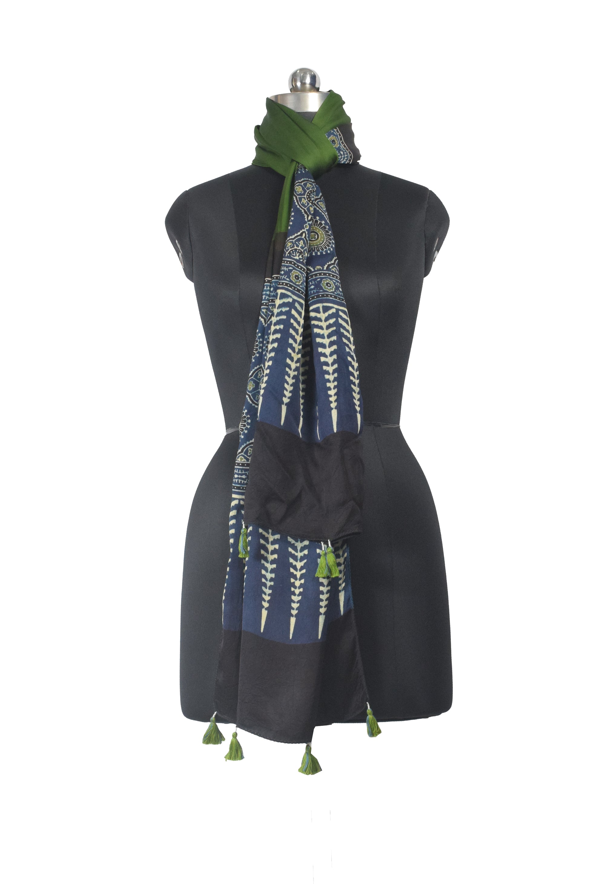 Ajrakh Modal Silk Part Natural Dye Half Plain Dyeing Hand Block Print Stole With Tassels - 2.1 Mtr Length - SKU : AI26902B