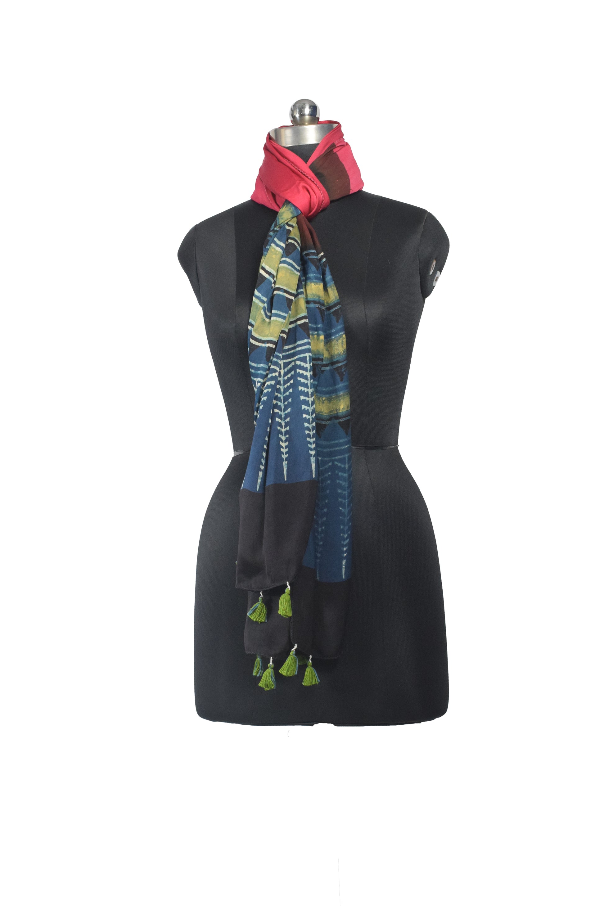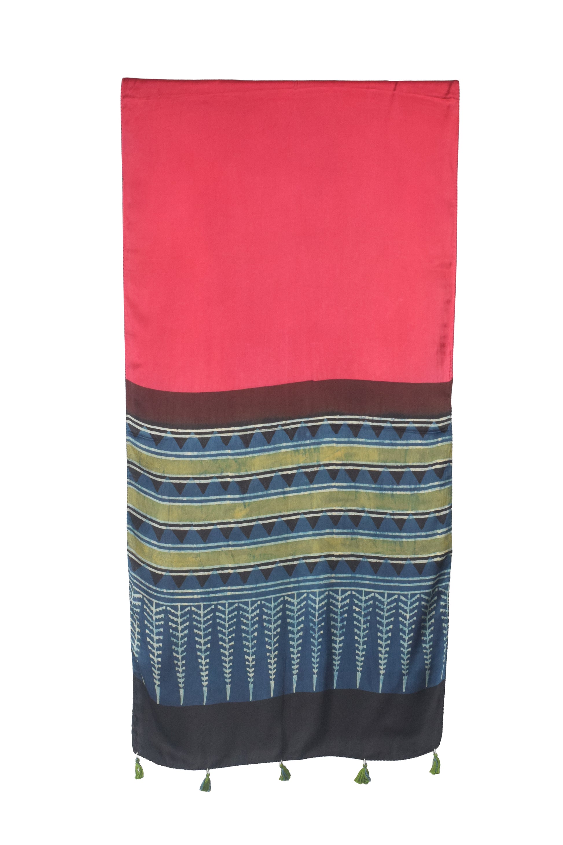 Ajrakh Modal Silk Part Natural Dye Half Plain Dyeing Hand Block Print Stole With Tassels - 2.1 Mtr Length - SKU : AI2690BE