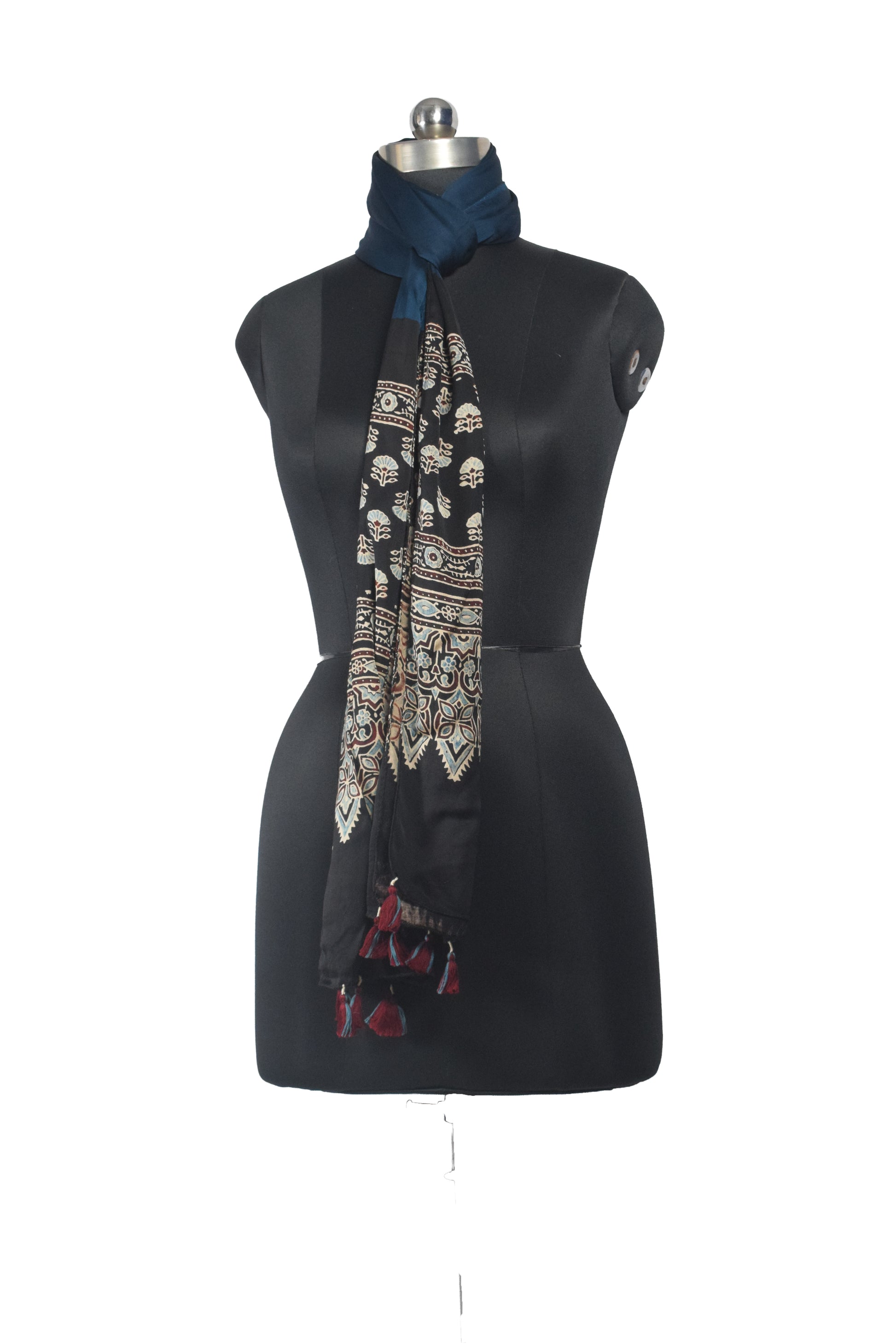 Ajrakh Modal Silk Part Natural Dye Half Plain Dyeing Hand Block Print Stole With Tassels - 2.1 Mtr Length - SKU : AI26902P